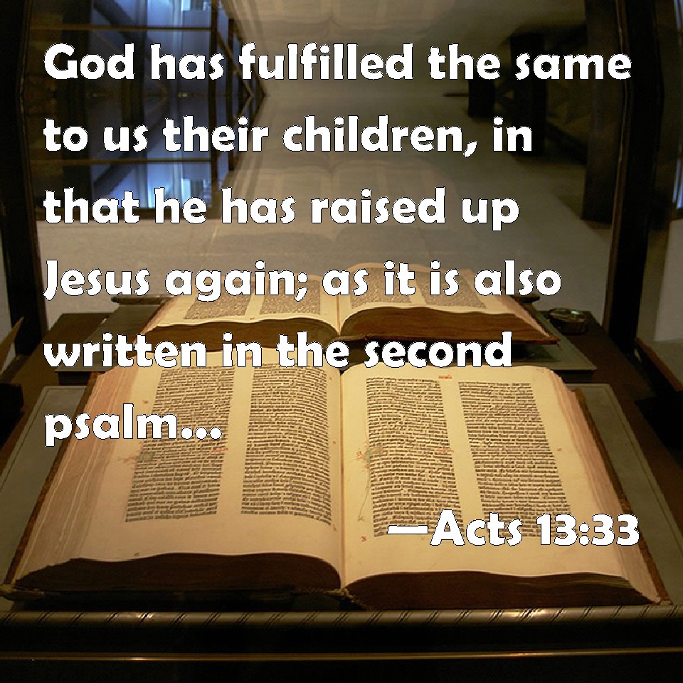 Choose a Background Acts 13:33 God has fulfilled the same to us their children, in that he has raised up Jesus again; as it is also written in the second psalm, You are my Son, this day have I begotten you. KJV: God hath fulfilled the same unto us their children, in that he hath raised up Jesus again; as it is also written in the second psalm, Thou art my Son, this day have I begotten thee. DRB: This same God hath fulfilled to our children, raising up Jesus, as in the second psalm also is written: Thou art my Son, this day have I begotten thee. DBT: that God has fulfilled this to us their children, having raised up Jesus; as it is also written in the second psalm, Thou art my Son: this day have I begotten thee. ERV: how that God hath fulfilled the same unto our children, in that he raised up Jesus; as also it is written in the second psalm, Thou art my Son, this day have I begotten thee. WBT: God hath fulfilled the same to us their children, in that he hath raised up Jesus again; as it is also written in the second psalm, Thou art my Son, this day have I begotten thee. WEB: that God has fulfilled the same to us, their children, in that he raised up Jesus. As it is also written in the second psalm, 'You are my Son. Today I have become your father.' YLT: God hath in full completed this to us their children, having raised up Jesus, as also in the second Psalm it hath been written, My Son thou art — I to-day have begotten thee.Links Acts 13:33 NIV • Acts 13:33 NLT • Acts 13:33 ESV • Acts 13:33 NASB • Acts 13:33 KJV • Acts 13:33 Interlinear • Acts 13:33 Commentaries • Acts 13:33 Parallel Texts • Acts 13:33 Bible Apps • Acts 13:33 Parallel • Bible Hub |