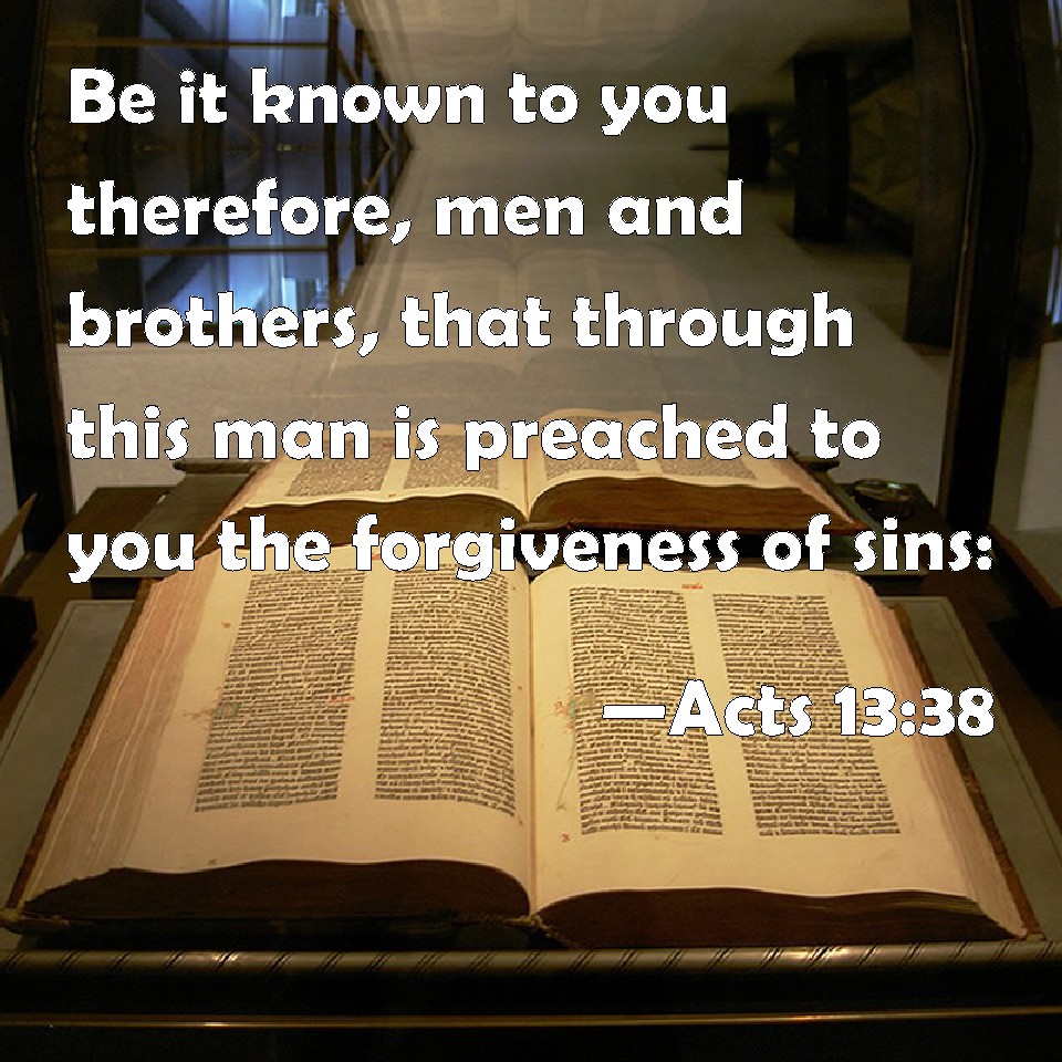 Choose a Background Acts 13:38 Be it known to you therefore, men and brothers, that through this man is preached to you the forgiveness of sins: KJV: Be it known unto you therefore, men and brethren, that through this man is preached unto you the forgiveness of sins: DRB: Be it known therefore to you, men, brethren, that through him forgiveness of sins is preached to you: and from all the things, from which you could not be justified by the law of Moses. DBT: Be it known unto you, therefore, brethren, that through this man remission of sins is preached to you, ERV: Be it known unto you therefore, brethren, that through this man is proclaimed unto you remission of sins: WBT: Be it known to you therefore, men, brethren, that through this man is preached to you the forgiveness of sins; WEB: Be it known to you therefore, brothers, that through this man is proclaimed to you remission of sins, YLT: 'Let it therefore be known to you, men, brethren, that through this one to you is the forgiveness of sins declared,Links Acts 13:38 NIV • Acts 13:38 NLT • Acts 13:38 ESV • Acts 13:38 NASB • Acts 13:38 KJV • Acts 13:38 Interlinear • Acts 13:38 Commentaries • Acts 13:38 Parallel Texts • Acts 13:38 Bible Apps • Acts 13:38 Parallel • Bible Hub |