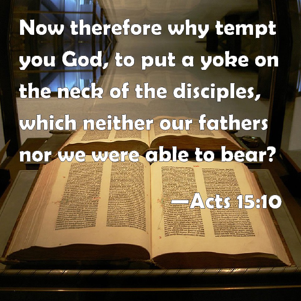 Choose a Background Acts 15:10 Now therefore why tempt you God, to put a yoke on the neck of the disciples, which neither our fathers nor we were able to bear? KJV: Now therefore why tempt ye God, to put a yoke upon the neck of the disciples, which neither our fathers nor we were able to bear? DRB: Now therefore, why tempt you God to put a yoke upon the necks of the disciples, which neither our fathers nor we have been able to bear? DBT: Now therefore why tempt ye God, by putting a yoke upon the neck of the disciples, which neither our fathers nor we have been able to bear? ERV: Now therefore why tempt ye God, that ye should put a yoke upon the neck of the disciples, which neither our fathers nor we were able to bear? WBT: Now therefore why tempt ye God, to put a yoke upon the neck of the disciples, which neither our fathers nor we were able to bear? WEB: Now therefore why do you tempt God, that you should put a yoke on the neck of the disciples which neither our fathers nor we were able to bear? YLT: now, therefore, why do ye tempt God, to put a yoke upon the neck of the disciples, which neither our fathers nor we were able to bear?Links Acts 15:10 NIV • Acts 15:10 NLT • Acts 15:10 ESV • Acts 15:10 NASB • Acts 15:10 KJV • Acts 15:10 Interlinear • Acts 15:10 Commentaries • Acts 15:10 Parallel Texts • Acts 15:10 Bible Apps • Acts 15:10 Parallel • Bible Hub |