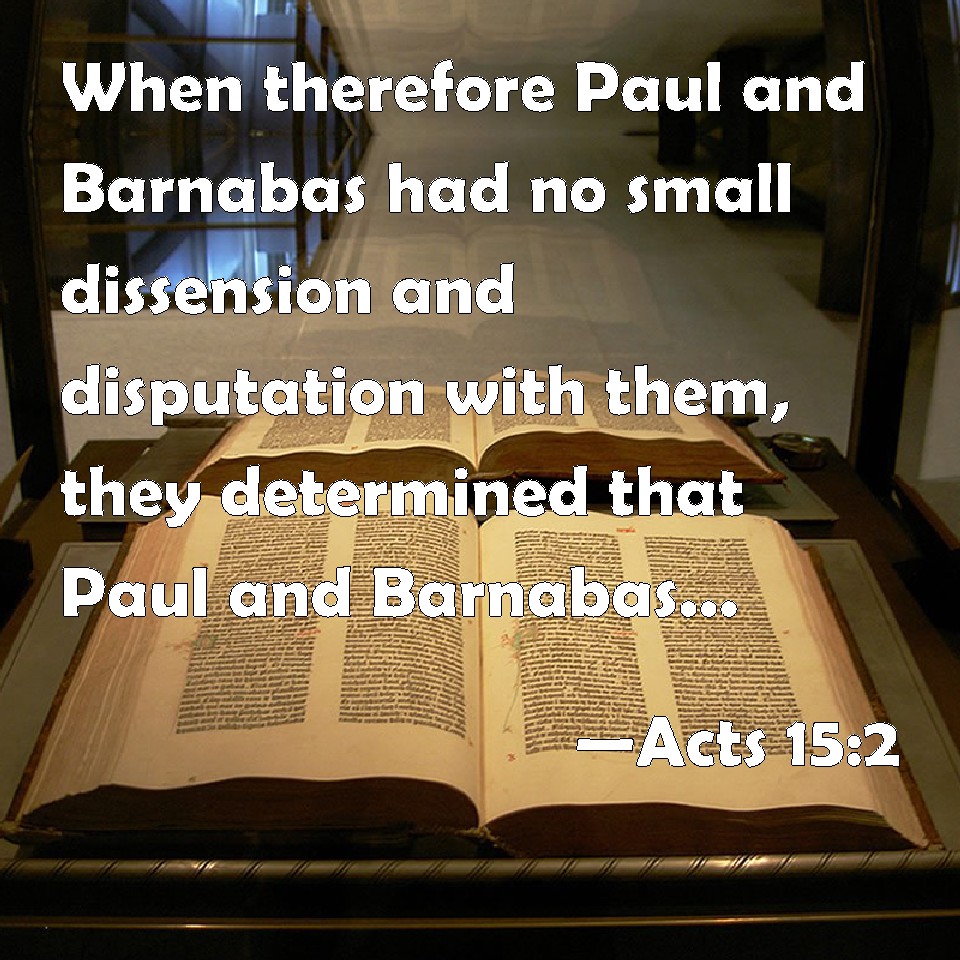 Choose a Background Acts 15:2 When therefore Paul and Barnabas had no small dissension and disputation with them, they determined that Paul and Barnabas, and certain other of them, should go up to Jerusalem to the apostles and elders about this question. KJV: When therefore Paul and Barnabas had no small dissension and disputation with them, they determined that Paul and Barnabas, and certain other of them, should go up to Jerusalem unto the apostles and elders about this question. DRB: And when Paul and Barnabas had no small contest with them, they determined that Paul and Barnabas, and certain others of the other side, should go up to the apostles and priests to Jerusalem about this question. DBT: A commotion therefore having taken place, and no small discussion on the part of Paul and Barnabas against them, they arranged that Paul and Barnabas, and certain others from amongst them, should go up to Jerusalem to the apostles and elders about this question. ERV: And when Paul and Barnabas had no small dissension and questioning with them, the brethren appointed that Paul and Barnabas, and certain other of them, should go up to Jerusalem unto the apostles and elders about this question. WBT: When therefore Paul and Barnabas had no small dissension and disputation with them, they determined that Paul and Barnabas, and certain others of them, should go to Jerusalem to the apostles and elders about this question. WEB: Therefore when Paul and Barnabas had no small discord and discussion with them, they appointed Paul and Barnabas, and some others of them, to go up to Jerusalem to the apostles and elders about this question. YLT: there having been, therefore, not a little dissension and disputation to Paul and Barnabas with them, they arranged for Paul and Barnabas, and certain others of them, to go up unto the apostles and elders to Jerusalem about this question,Links Acts 15:2 NIV • Acts 15:2 NLT • Acts 15:2 ESV • Acts 15:2 NASB • Acts 15:2 KJV • Acts 15:2 Interlinear • Acts 15:2 Commentaries • Acts 15:2 Parallel Texts • Acts 15:2 Bible Apps • Acts 15:2 Parallel • Bible Hub |