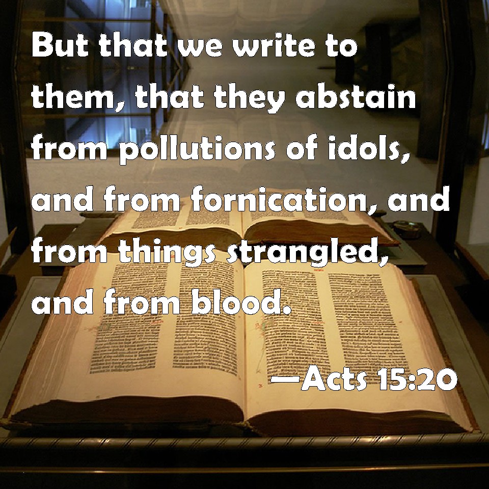 Choose a Background Acts 15:20 But that we write to them, that they abstain from pollutions of idols, and from fornication, and from things strangled, and from blood. KJV: But that we write unto them, that they abstain from pollutions of idols, and from fornication, and from things strangled, and from blood. DRB: But that we write unto them, that they refrain themselves from the pollutions of idols, and from fornication, and from things strangled, and from blood. DBT: but to write to them to abstain from pollutions of idols, and from fornication, and from what is strangled, and from blood. ERV: but that we write unto them, that they abstain from the pollutions of idols, and from fornication, and from what is strangled, and from blood. WBT: But that we write to them that they abstain from pollutions of idols, and from lewdness, and from things strangled, and from blood. WEB: but that we write to them that they abstain from the pollution of idols, from sexual immorality, from what is strangled, and from blood. YLT: but to write to them to abstain from the pollutions of the idols, and the whoredom, and the strangled thing; and the blood;Links Acts 15:20 NIV • Acts 15:20 NLT • Acts 15:20 ESV • Acts 15:20 NASB • Acts 15:20 KJV • Acts 15:20 Interlinear • Acts 15:20 Commentaries • Acts 15:20 Parallel Texts • Acts 15:20 Bible Apps • Acts 15:20 Parallel • Bible Hub |