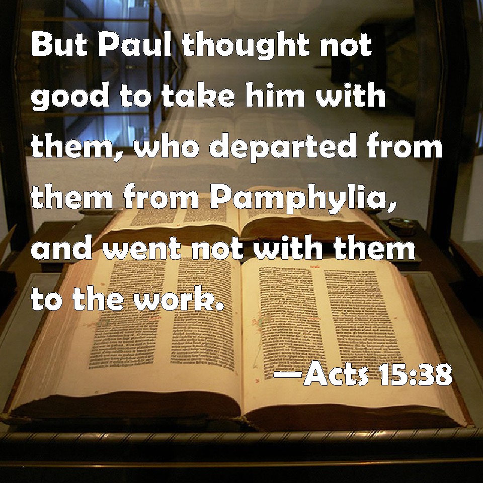 Choose a Background Acts 15:38 But Paul thought not good to take him with them, who departed from them from Pamphylia, and went not with them to the work. KJV: But Paul thought not good to take him with them, who departed from them from Pamphylia, and went not with them to the work. DRB: But Paul desired that he (as having departed from them out of Pamphylia, and not gone with them to the work) might not be received. DBT: but Paul thought it not well to take with them him who had abandoned them, going back from Pamphylia, and had not gone with them to the work. ERV: But Paul thought not good to take with them him who withdrew from them from Pamphylia, and went not with them to the work. WBT: But Paul thought not good to take him with them, who departed from them from Pamphylia, and went not with them to the work. WEB: But Paul didn't think that it was a good idea to take with them someone who had withdrawn from them in Pamphylia, and didn't go with them to do the work. YLT: and Paul was not thinking it good to take him with them who withdrew from them from Pamphylia, and did not go with them to the work;Links Acts 15:38 NIV • Acts 15:38 NLT • Acts 15:38 ESV • Acts 15:38 NASB • Acts 15:38 KJV • Acts 15:38 Interlinear • Acts 15:38 Commentaries • Acts 15:38 Parallel Texts • Acts 15:38 Bible Apps • Acts 15:38 Parallel • Bible Hub |