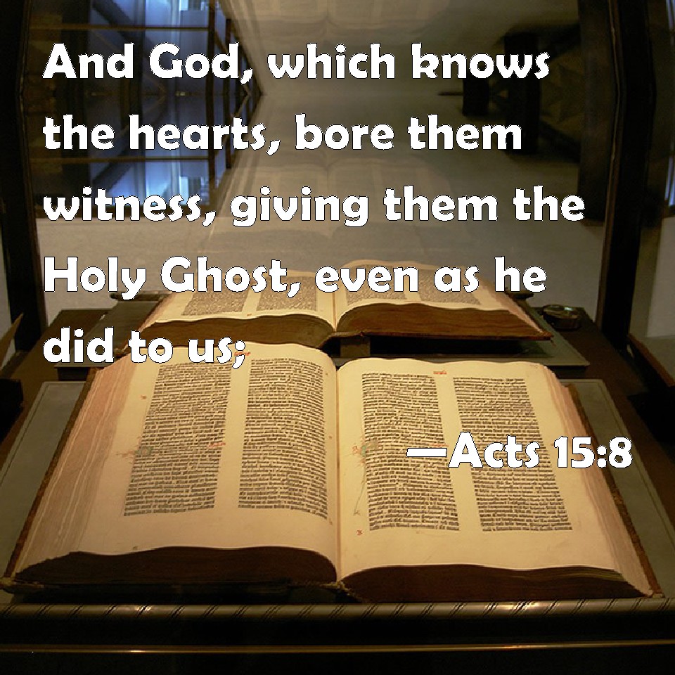 Choose a Background Acts 15:8 And God, which knows the hearts, bore them witness, giving them the Holy Ghost, even as he did to us; KJV: And God, which knoweth the hearts, bare them witness, giving them the Holy Ghost, even as he did unto us; DRB: And God, who knoweth the hearts, gave testimony, giving unto them the Holy Ghost, as well as to us; DBT: And the heart-knowing God bore them witness, giving them the Holy Spirit as to us also, ERV: And God, which knoweth the heart, bare them witness, giving them the Holy Ghost, even as he did unto us; WBT: And God, who knoweth the hearts, bore them witness, giving to them the Holy Spirit, even as he did to us: WEB: God, who knows the heart, testified about them, giving them the Holy Spirit, just like he did to us. YLT: and the heart-knowing God did bare them testimony, having given to them the Holy Spirit, even as also to us,Links Acts 15:8 NIV • Acts 15:8 NLT • Acts 15:8 ESV • Acts 15:8 NASB • Acts 15:8 KJV • Acts 15:8 Interlinear • Acts 15:8 Commentaries • Acts 15:8 Parallel Texts • Acts 15:8 Bible Apps • Acts 15:8 Parallel • Bible Hub |