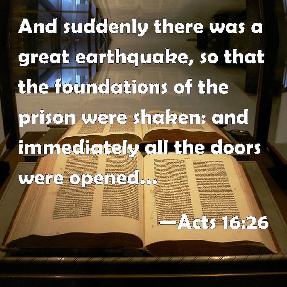 Choose a Background Acts 16:26 And suddenly there was a great earthquake, so that the foundations of the prison were shaken: and immediately all the doors were opened, and every one's bands were loosed. KJV: And suddenly there was a great earthquake, so that the foundations of the prison were shaken: and immediately all the doors were opened, and every one's bands were loosed. DRB: And suddenly there was a great earthquake, so that the foundations of the prison were shaken. And immediately all the doors were opened, and the bands of all were loosed. DBT: And suddenly there was a great earthquake, so that the foundations of the prison shook, and all the doors were immediately opened, and the bonds of all loosed. ERV: and suddenly there was a great earthquake, so that the foundations of the prison-house were shaken: and immediately all the doors were opened; and every one's bands were loosed. WBT: And suddenly there was a great earthquake, so that the foundations of the prison were shaken: and immediately all the doors were opened, and every one's bands were loosed. WEB: Suddenly there was a great earthquake, so that the foundations of the prison were shaken; and immediately all the doors were opened, and everyone's bonds were loosened. YLT: and suddenly a great earthquake came, so that the foundations of the prison were shaken, opened also presently were all the doors, and of all — the bands were loosed;Links Acts 16:26 NIV • Acts 16:26 NLT • Acts 16:26 ESV • Acts 16:26 NASB • Acts 16:26 KJV • Acts 16:26 Interlinear • Acts 16:26 Commentaries • Acts 16:26 Parallel Texts • Acts 16:26 Bible Apps • Acts 16:26 Parallel • Bible Hub |