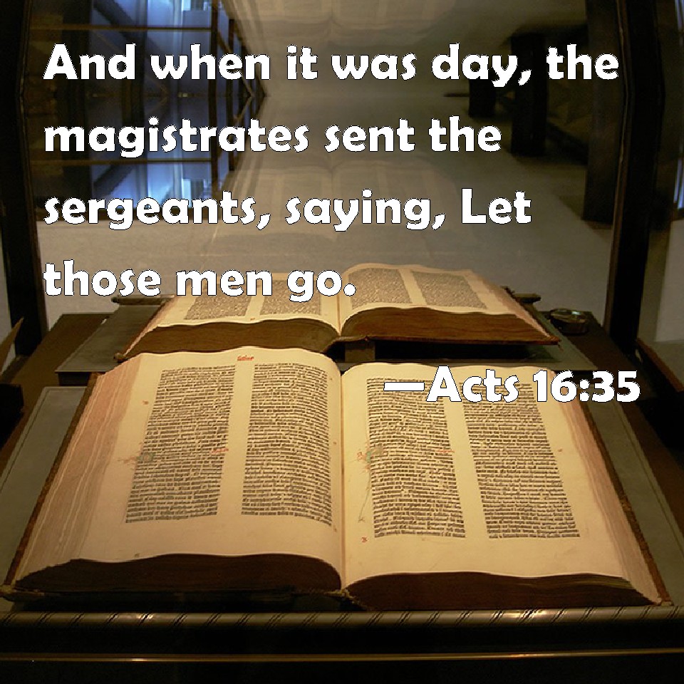 Choose a Background Acts 16:35 And when it was day, the magistrates sent the sergeants, saying, Let those men go. KJV: And when it was day, the magistrates sent the serjeants, saying, Let those men go. DRB: And when the day was come, the magistrates sent the serjeants, saying, Let those men go. DBT: And when it was day, the praetors sent the lictors, saying, Let those men go. ERV: But when it was day, the magistrates sent the serjeants, saying, Let those men go. WBT: And when it was day, the magistrates sent the sergeants, saying, Let those men go. WEB: But when it was day, the magistrates sent the sergeants, saying, "Let those men go." YLT: And day having come, the magistrates sent the rod-bearers, saying, 'Let those men go;'Links Acts 16:35 NIV • Acts 16:35 NLT • Acts 16:35 ESV • Acts 16:35 NASB • Acts 16:35 KJV • Acts 16:35 Interlinear • Acts 16:35 Commentaries • Acts 16:35 Parallel Texts • Acts 16:35 Bible Apps • Acts 16:35 Parallel • Bible Hub |