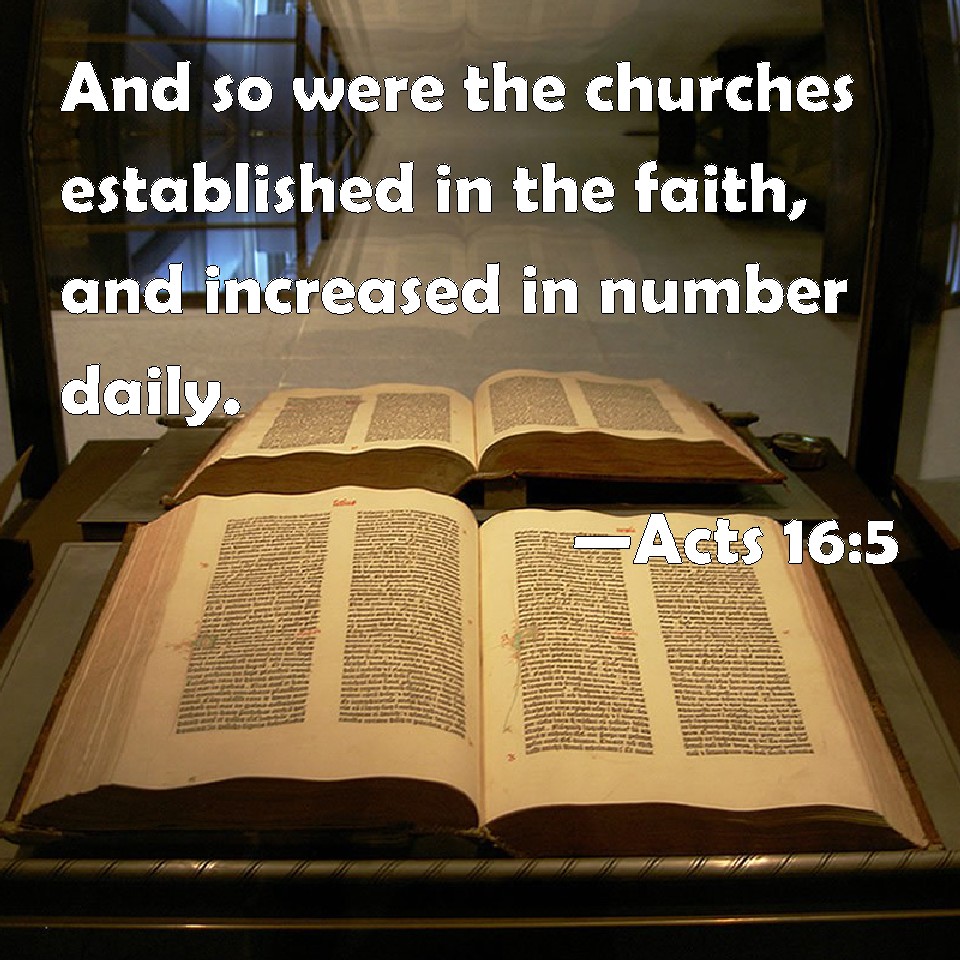 Choose a Background Acts 16:5 And so were the churches established in the faith, and increased in number daily. KJV: And so were the churches established in the faith, and increased in number daily. DRB: And the churches were confirmed in faith, and increased in number daily. DBT: The assemblies therefore were confirmed in the faith, and increased in number every day. ERV: So the churches were strengthened in the faith, and increased in number daily. WBT: And so were the churches established in the faith, and increased in number daily. WEB: So the assemblies were strengthened in the faith, and increased in number daily. YLT: then, indeed, were the assemblies established in the faith, and were abounding in number every day;Links Acts 16:5 NIV • Acts 16:5 NLT • Acts 16:5 ESV • Acts 16:5 NASB • Acts 16:5 KJV • Acts 16:5 Interlinear • Acts 16:5 Commentaries • Acts 16:5 Parallel Texts • Acts 16:5 Bible Apps • Acts 16:5 Parallel • Bible Hub |