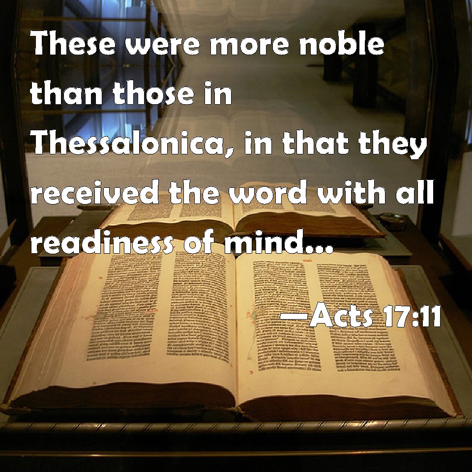 Choose a Background Acts 17:11 These were more noble than those in Thessalonica, in that they received the word with all readiness of mind, and searched the scriptures daily, whether those things were so. KJV: These were more noble than those in Thessalonica, in that they received the word with all readiness of mind, and searched the scriptures daily, whether those things were so. DRB: Now these were more noble than those in Thessalonica, who received the word with all eagerness, daily searching the scriptures, whether these things were so. DBT: And these were more noble than those in Thessalonica, receiving the word with all readiness of mind, daily searching the scriptures if these things were so. ERV: Now these were more noble than those in Thessalonica, in that they received the word with all readiness of mind, examining the scriptures daily, whether these things were so. WBT: These were more noble than those in Thessalonica, in that they received the word with all readiness of mind, and searched the scriptures daily, whether those things were so. WEB: Now these were more noble than those in Thessalonica, in that they received the word with all readiness of the mind, examining the Scriptures daily to see whether these things were so. YLT: and these were more noble than those in Thessalonica, they received the word with all readiness of mind, every day examining the Writings whether those things were so;Links Acts 17:11 NIV • Acts 17:11 NLT • Acts 17:11 ESV • Acts 17:11 NASB • Acts 17:11 KJV • Acts 17:11 Interlinear • Acts 17:11 Commentaries • Acts 17:11 Parallel Texts • Acts 17:11 Bible Apps • Acts 17:11 Parallel • Bible Hub |