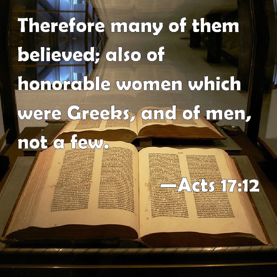 Choose a Background Acts 17:12 Therefore many of them believed; also of honorable women which were Greeks, and of men, not a few. KJV: Therefore many of them believed; also of honourable women which were Greeks, and of men, not a few. DRB: And many indeed of them believed, and of honourable women that were Gentiles, and of men not a few. DBT: Therefore many from among them believed, and of Grecian women of the upper classes and men not a few. ERV: Many of them therefore believed; also of the Greek women of honourable estate, and of men, not a few. WBT: Therefore many of them believed; also of honorable women who were Greeks, and of men not a few. WEB: Many of them therefore believed; also of the prominent Greek women, and not a few men. YLT: many, indeed, therefore, of them did believe, and of the honourable Greek women and men not a few.Links Acts 17:12 NIV • Acts 17:12 NLT • Acts 17:12 ESV • Acts 17:12 NASB • Acts 17:12 KJV • Acts 17:12 Interlinear • Acts 17:12 Commentaries • Acts 17:12 Parallel Texts • Acts 17:12 Bible Apps • Acts 17:12 Parallel • Bible Hub |