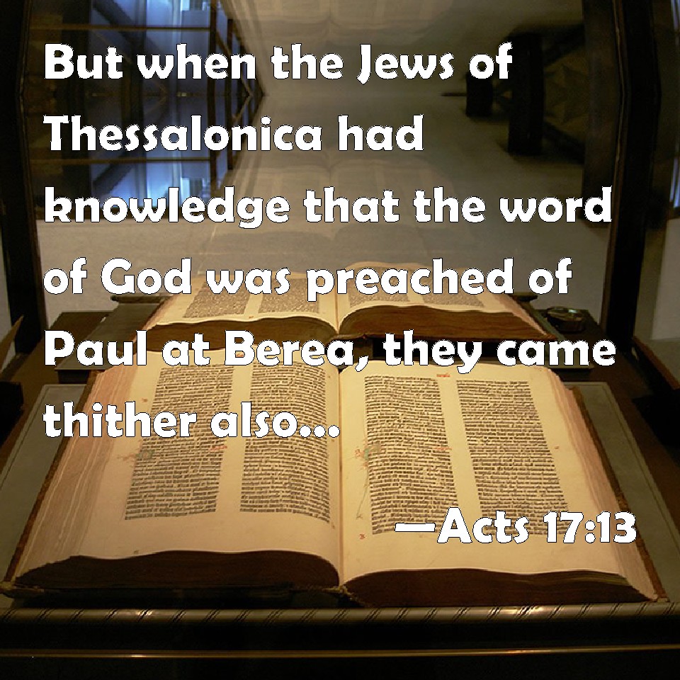 Choose a Background Acts 17:13 But when the Jews of Thessalonica had knowledge that the word of God was preached of Paul at Berea, they came thither also, and stirred up the people. KJV: But when the Jews of Thessalonica had knowledge that the word of God was preached of Paul at Berea, they came thither also, and stirred up the people. DRB: And when the Jews of Thessalonica had knowledge that the word of God was also preached by Paul at Berea, they came thither also, stirring up and troubling the multitude. DBT: But when the Jews from Thessalonica knew that the word of God was announced in Berea also by Paul, they came there also, stirring up the crowds. ERV: But when the Jews of Thessalonica had knowledge that the word of God was proclaimed of Paul at Beroea also, they came thither likewise, stirring up and troubling the multitudes. WBT: But when the Jews of Thessalonica had knowledge that the word of God was preached by Paul at Berea, they came thither also, and stirred up the people. WEB: But when the Jews of Thessalonica had knowledge that the word of God was proclaimed by Paul at Beroea also, they came there likewise, agitating the multitudes. YLT: And when the Jews from Thessalonica knew that also in Berea was the word of God declared by Paul, they came thither also, agitating the multitudes;Links Acts 17:13 NIV • Acts 17:13 NLT • Acts 17:13 ESV • Acts 17:13 NASB • Acts 17:13 KJV • Acts 17:13 Interlinear • Acts 17:13 Commentaries • Acts 17:13 Parallel Texts • Acts 17:13 Bible Apps • Acts 17:13 Parallel • Bible Hub |