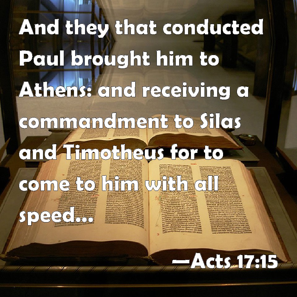 Choose a Background Acts 17:15 And they that conducted Paul brought him to Athens: and receiving a commandment to Silas and Timotheus for to come to him with all speed, they departed. KJV: And they that conducted Paul brought him unto Athens: and receiving a commandment unto Silas and Timotheus for to come to him with all speed, they departed. DRB: And they that conducted Paul, brought him as far as Athens; and receiving a commandment from him to Silas and Timothy, that they should come to him with all speed, they departed. DBT: But they that conducted Paul brought him as far as Athens; and, having received a commandment to Silas and Timotheus, that they should come to him as quickly as possible, they departed. ERV: But they that conducted Paul brought him as far as Athens: and receiving a commandment unto Silas and Timothy that they should come to him with all speed, they departed. WBT: And they that conducted Paul brought him to Athens: and receiving a commandment to Silas and Timothy to come to him with all speed, they departed. WEB: But those who escorted Paul brought him as far as Athens. Receiving a commandment to Silas and Timothy that they should come to him very quickly, they departed. YLT: And those conducting Paul, brought him unto Athens, and having received a command unto Silas and Timotheus that with all speed they may come unto him, they departed;Links Acts 17:15 NIV • Acts 17:15 NLT • Acts 17:15 ESV • Acts 17:15 NASB • Acts 17:15 KJV • Acts 17:15 Interlinear • Acts 17:15 Commentaries • Acts 17:15 Parallel Texts • Acts 17:15 Bible Apps • Acts 17:15 Parallel • Bible Hub |