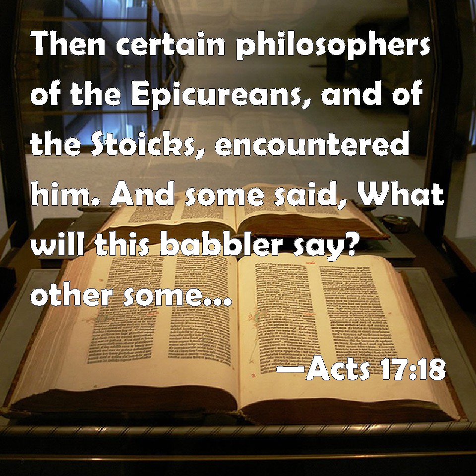 Choose a Background Acts 17:18 Then certain philosophers of the Epicureans, and of the Stoicks, encountered him. And some said, What will this babbler say? other some, He seems to be a setter forth of strange gods: because he preached to them Jesus, and the resurrection. KJV: Then certain philosophers of the Epicureans, and of the Stoicks, encountered him. And some said, What will this babbler say? other some, He seemeth to be a setter forth of strange gods: because he preached unto them Jesus, and the resurrection. DRB: And certain philosophers of the Epicureans and of the Stoics disputed with him; and some said: What is it, that this word sower would say? But others: He seemeth to be a setter forth of new gods; because he preached to them Jesus and the resurrection. DBT: But some also of the Epicurean and Stoic philosophers attacked him. And some said, What would this chatterer say? and some, He seems to be an announcer of foreign demons, because he announced the glad tidings of Jesus and the resurrection to them. ERV: And certain also of the Epicurean and Stoic philosophers encountered him. And some said, What would this babbler say? other some, He seemeth to be a setter forth of strange gods: because he preached Jesus and the resurrection. WBT: Then certain philosophers of the Epicureans, and of the Stoics, encountered him. And some said, What will this babbler say? some others, He seemeth to be a setter-forth of strange gods: because he preached to them Jesus, and the resurrection. WEB: Some of the Epicurean and Stoic philosophers also were conversing with him. Some said, "What does this babbler want to say?" Others said, "He seems to be advocating foreign deities," because he preached Jesus and the resurrection. YLT: And certain of the Epicurean and of the Stoic philosophers, were meeting together to see him, and some were saying, 'What would this seed picker wish to say?' and others, 'Of strange demons he doth seem to be an announcer;' because Jesus and the rising again he did proclaim to them as good news,Links Acts 17:18 NIV • Acts 17:18 NLT • Acts 17:18 ESV • Acts 17:18 NASB • Acts 17:18 KJV • Acts 17:18 Interlinear • Acts 17:18 Commentaries • Acts 17:18 Parallel Texts • Acts 17:18 Bible Apps • Acts 17:18 Parallel • Bible Hub |