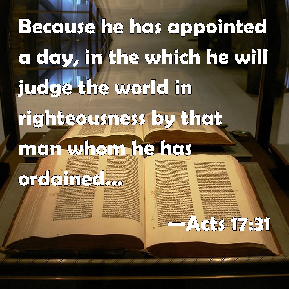 Choose a Background Acts 17:31 Because he has appointed a day, in the which he will judge the world in righteousness by that man whom he has ordained; whereof he has given assurance to all men, in that he has raised him from the dead. KJV: Because he hath appointed a day, in the which he will judge the world in righteousness by that man whom he hath ordained; whereof he hath given assurance unto all men, in that he hath raised him from the dead. DRB: Because he hath appointed a day wherein he will judge the world in equity, by the man whom he hath appointed; giving faith to all, by raising him up from the dead. DBT: because he has set a day in which he is going to judge the habitable earth in righteousness by the man whom he has appointed, giving the proof of it to all in having raised him from among the dead. ERV: inasmuch as he hath appointed a day, in the which he will judge the world in righteousness by the man whom he hath ordained; whereof he hath given assurance unto all men, in that he hath raised him from the dead. WBT: Because he hath appointed a day, in which he will judge the world in righteousness, by that man whom he hath ordained: of which he hath given assurance to all men, in that he hath raised him from the dead. WEB: because he has appointed a day in which he will judge the world in righteousness by the man whom he has ordained; of which he has given assurance to all men, in that he has raised him from the dead." YLT: because He did set a day in which He is about to judge the world in righteousness, by a man whom He did ordain, having given assurance to all, having raised him out of the dead.'Links Acts 17:31 NIV • Acts 17:31 NLT • Acts 17:31 ESV • Acts 17:31 NASB • Acts 17:31 KJV • Acts 17:31 Interlinear • Acts 17:31 Commentaries • Acts 17:31 Parallel Texts • Acts 17:31 Bible Apps • Acts 17:31 Parallel • Bible Hub |