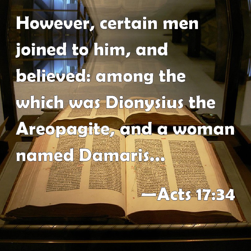 Choose a Background Acts 17:34 However, certain men joined to him, and believed: among the which was Dionysius the Areopagite, and a woman named Damaris, and others with them. KJV: Howbeit certain men clave unto him, and believed: among the which was Dionysius the Areopagite, and a woman named Damaris, and others with them. DRB: But certain men adhering to him, did believe; among whom was also Dionysius, the Areopagite, and a woman named Damaris, and others with them. DBT: But some men joining themselves to him believed; among whom also was Dionysius the Areopagite, and a woman by name Damaris, and others with them. ERV: But certain men clave unto him, and believed: among whom also was Dionysius the Areopagite, and a woman named Damaris, and others with them. WBT: But certain men adhered to him, and believed: among whom was Dionysius the Areopagite, and a woman named Damaris, and others with them. WEB: But certain men joined with him, and believed, among whom also was Dionysius the Areopagite, and a woman named Damaris, and others with them. YLT: and certain men having cleaved to him, did believe, among whom is also Dionysius the Areopagite, and a woman, by name Damaris, and others with them.Links Acts 17:34 NIV • Acts 17:34 NLT • Acts 17:34 ESV • Acts 17:34 NASB • Acts 17:34 KJV • Acts 17:34 Interlinear • Acts 17:34 Commentaries • Acts 17:34 Parallel Texts • Acts 17:34 Bible Apps • Acts 17:34 Parallel • Bible Hub |