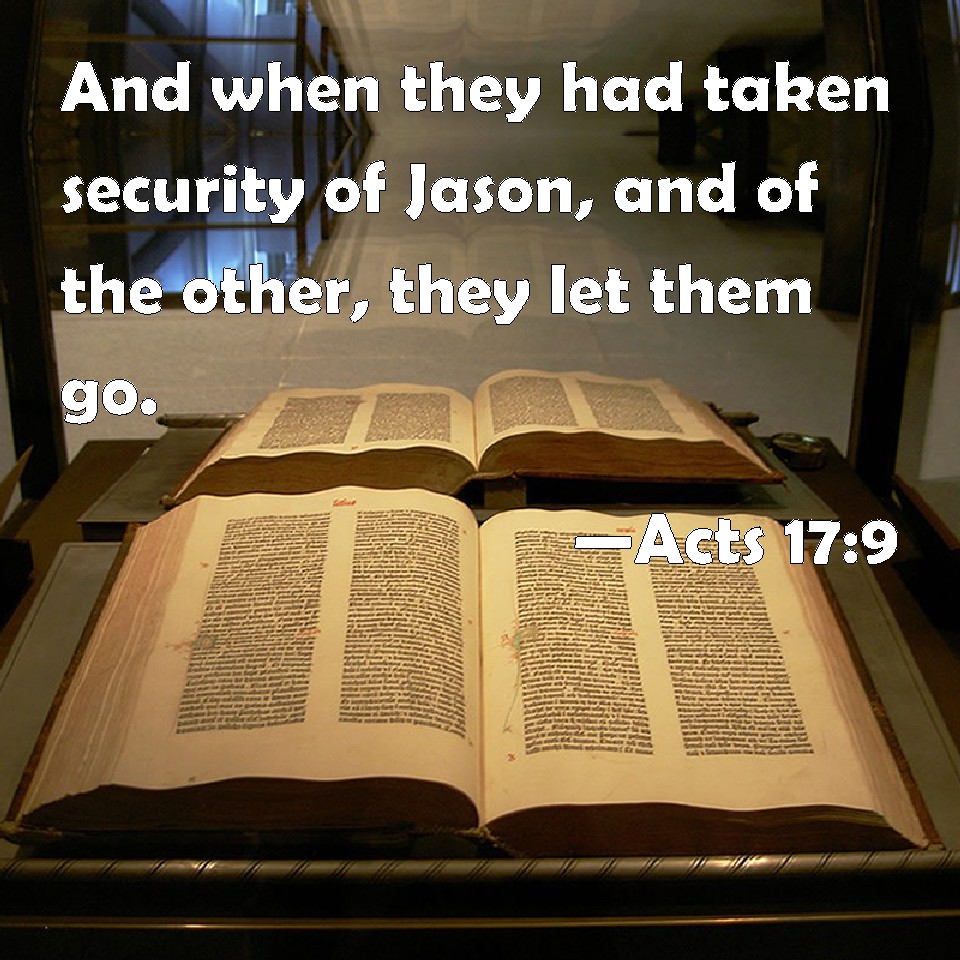 Choose a Background Acts 17:9 And when they had taken security of Jason, and of the other, they let them go. KJV: And when they had taken security of Jason, and of the other, they let them go. DRB: And having taken satisfaction of Jason and of the rest, they let them go. DBT: And having taken security of Jason and the rest, they let them go. ERV: And when they had taken security from Jason and the rest, they let them go. WBT: And when they had taken security of Jason and of the other, they let them go. WEB: When they had taken security from Jason and the rest, they let them go. YLT: and having taking security from Jason and the rest, they let them go.Links Acts 17:9 NIV • Acts 17:9 NLT • Acts 17:9 ESV • Acts 17:9 NASB • Acts 17:9 KJV • Acts 17:9 Interlinear • Acts 17:9 Commentaries • Acts 17:9 Parallel Texts • Acts 17:9 Bible Apps • Acts 17:9 Parallel • Bible Hub |