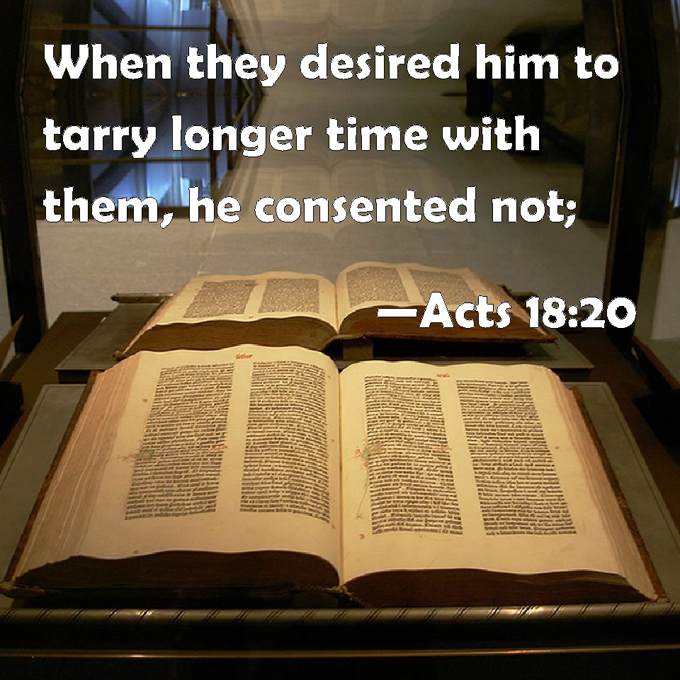 Choose a Background Acts 18:20 When they desired him to tarry longer time with them, he consented not; KJV: When they desired him to tarry longer time with them, he consented not; DRB: And when they desired him, that he would tarry a longer time, he consented not; DBT: And when they asked him that he would remain for a longer time with them he did not accede, ERV: And when they asked him to abide a longer time, he consented not; WBT: When they desired him to tarry longer time with them, he consented not: WEB: When they asked him to stay with them a longer time, he declined; YLT: and they having requested him to remain a longer time with them, he did not consent,Links Acts 18:20 NIV • Acts 18:20 NLT • Acts 18:20 ESV • Acts 18:20 NASB • Acts 18:20 KJV • Acts 18:20 Interlinear • Acts 18:20 Commentaries • Acts 18:20 Parallel Texts • Acts 18:20 Bible Apps • Acts 18:20 Parallel • Bible Hub |