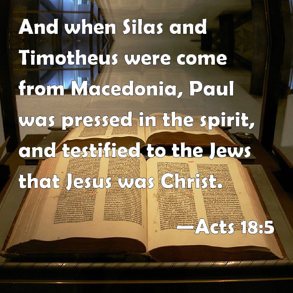 Choose a Background Acts 18:5 And when Silas and Timotheus were come from Macedonia, Paul was pressed in the spirit, and testified to the Jews that Jesus was Christ. KJV: And when Silas and Timotheus were come from Macedonia, Paul was pressed in the spirit, and testified to the Jews that Jesus was Christ. DRB: And when Silas and Timothy were come from Macedonia, Paul was earnest in preaching, testifying to the Jews, that Jesus is the Christ. DBT: And when both Silas and Timotheus came down from Macedonia, Paul was pressed in respect of the word, testifying to the Jews that Jesus was the Christ. ERV: But when Silas and Timothy came down from Macedonia, Paul was constrained by the word, testifying to the Jews that Jesus was the Christ. WBT: And when Silas and Timothy had come from Macedonia, Paul was pressed in spirit, and testified to the Jews, that Jesus was Christ. WEB: But when Silas and Timothy came down from Macedonia, Paul was compelled by the Spirit, testifying to the Jews that Jesus was the Christ. YLT: And when both Silas and Timotheus came down from Macedonia, Paul was pressed in the Spirit, testifying fully to the Jews Jesus the Christ;Links Acts 18:5 NIV • Acts 18:5 NLT • Acts 18:5 ESV • Acts 18:5 NASB • Acts 18:5 KJV • Acts 18:5 Interlinear • Acts 18:5 Commentaries • Acts 18:5 Parallel Texts • Acts 18:5 Bible Apps • Acts 18:5 Parallel • Bible Hub |