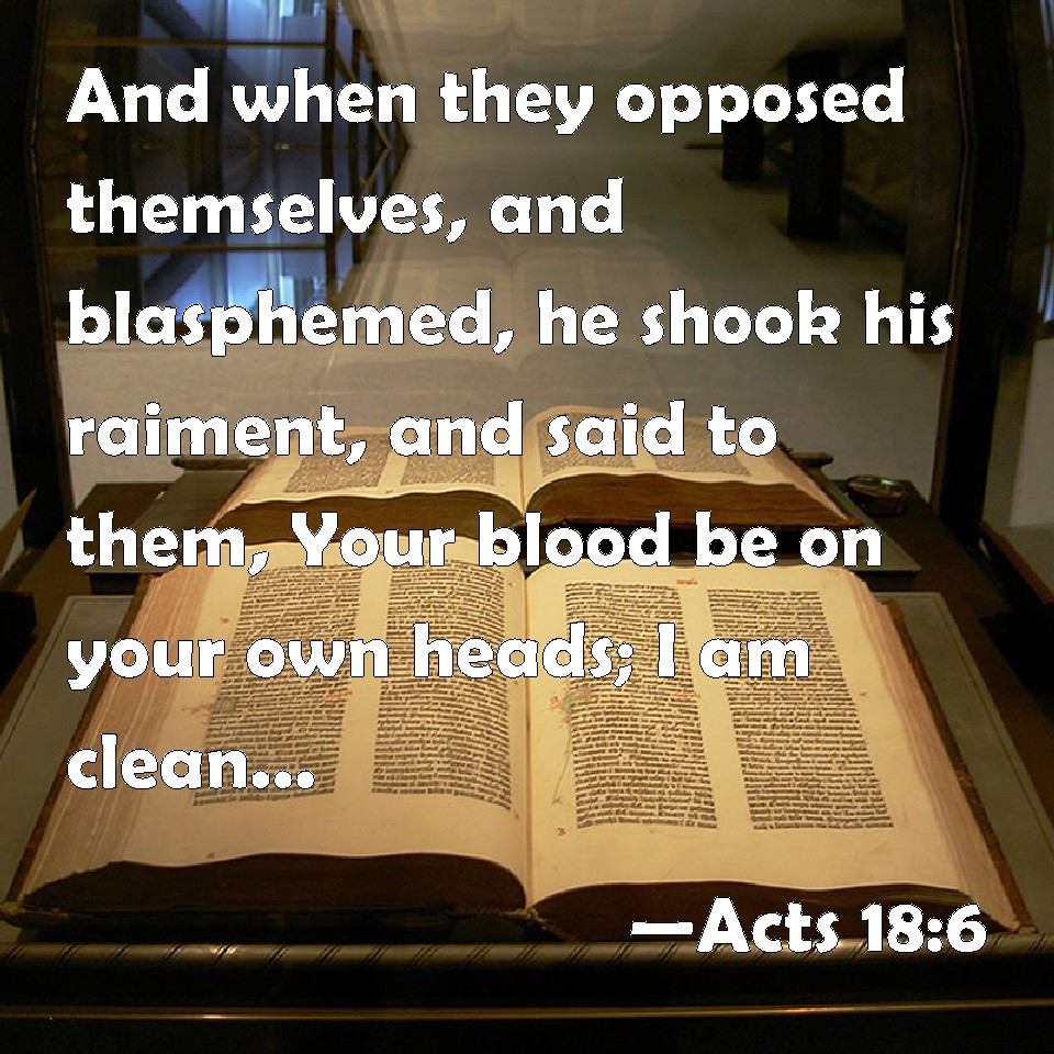 Choose a Background Acts 18:6 And when they opposed themselves, and blasphemed, he shook his raiment, and said to them, Your blood be on your own heads; I am clean; from now on I will go to the Gentiles. KJV: And when they opposed themselves, and blasphemed, he shook his raiment, and said unto them, Your blood be upon your own heads; I am clean: from henceforth I will go unto the Gentiles. DRB: But they gainsaying and blaspheming, he shook his garments, and said to them: Your blood be upon your own heads; I am clean: from henceforth I will go unto the Gentiles. DBT: But as they opposed and spoke injuriously, he shook his clothes, and said to them, Your blood be upon your own head: I am pure; from henceforth I will go to the nations. ERV: And when they opposed themselves, and blasphemed, he shook out his raiment, and said unto them, Your blood be upon your own heads; I am clean: from henceforth I will go unto the Gentiles. WBT: And when they opposed themselves, and blasphemed, he shook his raiment, and said to them, Your blood be upon your own heads: I am clean: from henceforth I will go to the Gentiles. WEB: When they opposed him and blasphemed, he shook out his clothing and said to them, "Your blood be on your own heads! I am clean. From now on, I will go to the Gentiles!" YLT: and on their resisting and speaking evil, having shaken his garments, he said unto them, 'Your blood is upon your head — I am clean; henceforth to the nations I will go on.'Links Acts 18:6 NIV • Acts 18:6 NLT • Acts 18:6 ESV • Acts 18:6 NASB • Acts 18:6 KJV • Acts 18:6 Interlinear • Acts 18:6 Commentaries • Acts 18:6 Parallel Texts • Acts 18:6 Bible Apps • Acts 18:6 Parallel • Bible Hub |