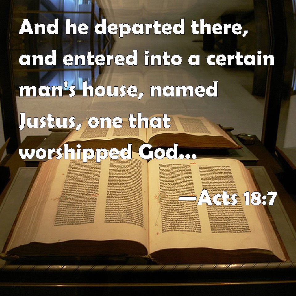 Choose a Background Acts 18:7 And he departed there, and entered into a certain man's house, named Justus, one that worshipped God, whose house joined hard to the synagogue. KJV: And he departed thence, and entered into a certain man's house, named Justus, one that worshipped God, whose house joined hard to the synagogue. DRB: And departing thence, he entered into the house of a certain man, named Titus Justus, one that worshipped God, whose house was adjoining to the synagogue. DBT: And departing thence he came to the house of a certain man, by name Justus, who worshipped God, whose house adjoined the synagogue. ERV: And he departed thence, and went into the house of a certain man named Titus Justus, one that worshipped God, whose house joined hard to the synagogue. WBT: And he departed thence, and entered into the house of a certain man named Justus, one that worshiped God, whose house joined close to the synagogue. WEB: He departed there, and went into the house of a certain man named Justus, one who worshiped God, whose house was next door to the synagogue. YLT: And having departed thence, he went to the house of a certain one, by name Justus, a worshipper of God, whose house was adjoining the synagogue,Links Acts 18:7 NIV • Acts 18:7 NLT • Acts 18:7 ESV • Acts 18:7 NASB • Acts 18:7 KJV • Acts 18:7 Interlinear • Acts 18:7 Commentaries • Acts 18:7 Parallel Texts • Acts 18:7 Bible Apps • Acts 18:7 Parallel • Bible Hub |