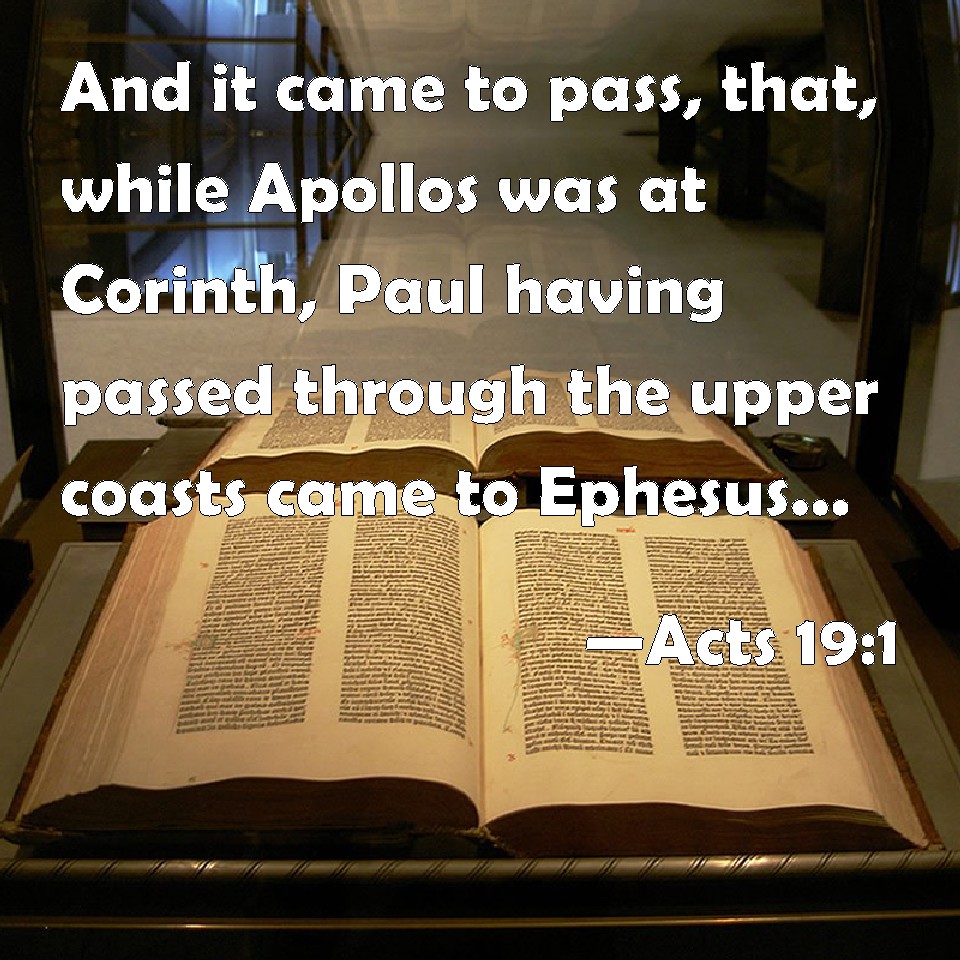 Choose a Background Acts 19:1 And it came to pass, that, while Apollos was at Corinth, Paul having passed through the upper coasts came to Ephesus: and finding certain disciples, KJV: And it came to pass, that, while Apollos was at Corinth, Paul having passed through the upper coasts came to Ephesus: and finding certain disciples, DRB: AND it came to pass, while Apollo was at Corinth, that Paul having passed through the upper coasts, came to Ephesus, and found certain disciples. DBT: And it came to pass, while Apollos was at Corinth, Paul, having passed through the upper districts, came to Ephesus, and finding certain disciples, ERV: And it came to pass, that, while Apollos was at Corinth, Paul having passed through the upper country came to Ephesus, and found certain disciples: WBT: And it came to pass, that while Apollos was at Corinth, Paul having passed through the upper region, came to Ephesus; and finding certain disciples, WEB: It happened that, while Apollos was at Corinth, Paul, having passed through the upper country, came to Ephesus, and found certain disciples. YLT: And it came to pass, in Apollos' being in Corinth, Paul having gone through the upper parts, came to Ephesus, and having found certain disciples,Links Acts 19:1 NIV • Acts 19:1 NLT • Acts 19:1 ESV • Acts 19:1 NASB • Acts 19:1 KJV • Acts 19:1 Interlinear • Acts 19:1 Commentaries • Acts 19:1 Parallel Texts • Acts 19:1 Bible Apps • Acts 19:1 Parallel • Bible Hub |