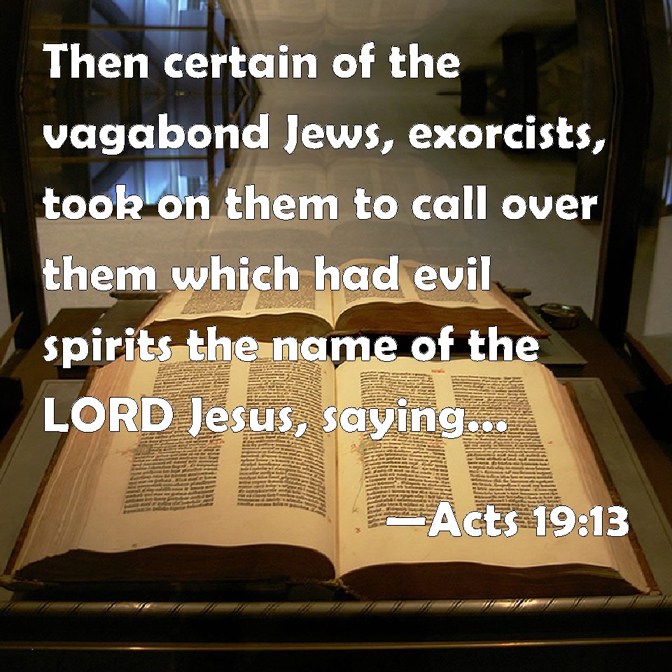 Choose a Background Acts 19:13 Then certain of the vagabond Jews, exorcists, took on them to call over them which had evil spirits the name of the LORD Jesus, saying, We adjure you by Jesus whom Paul preaches. KJV: Then certain of the vagabond Jews, exorcists, took upon them to call over them which had evil spirits the name of the Lord Jesus, saying, We adjure you by Jesus whom Paul preacheth. DRB: Now some also of the Jewish exorcists who went about, attempted to invoke over them that had evil spirits, the name of the Lord Jesus, saying: I conjure you by Jesus, whom Paul preacheth. DBT: And certain of the Jewish exorcists also, who went about, took in hand to call upon those who had wicked spirits the name of the Lord Jesus, saying, I adjure you by Jesus, whom Paul preaches. ERV: But certain also of the strolling Jews, exorcists, took upon them to name over them which had the evil spirits the name of the Lord Jesus, saying, I adjure you by Jesus whom Paul preacheth. WBT: Then certain of the vagabond Jews, exorcists, took upon them to call over them who had evil spirits, the name of the Lord Jesus, saying, We adjure you by Jesus whom Paul preacheth. WEB: But some of the itinerant Jews, exorcists, took on themselves to invoke over those who had the evil spirits the name of the Lord Jesus, saying, "We adjure you by Jesus whom Paul preaches." YLT: And certain of the wandering exorcist Jews, took upon them to name over those having the evil spirits the name of the Lord Jesus, saying, 'We adjure you by Jesus, whom Paul doth preach;'Links Acts 19:13 NIV • Acts 19:13 NLT • Acts 19:13 ESV • Acts 19:13 NASB • Acts 19:13 KJV • Acts 19:13 Interlinear • Acts 19:13 Commentaries • Acts 19:13 Parallel Texts • Acts 19:13 Bible Apps • Acts 19:13 Parallel • Bible Hub |