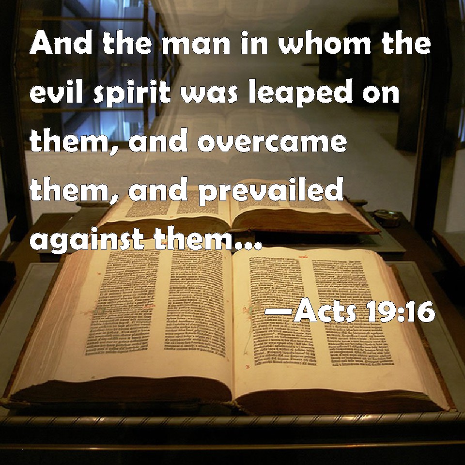Choose a Background Acts 19:16 And the man in whom the evil spirit was leaped on them, and overcame them, and prevailed against them, so that they fled out of that house naked and wounded. KJV: And the man in whom the evil spirit was leaped on them, and overcame them, and prevailed against them, so that they fled out of that house naked and wounded. DRB: And the man in whom the wicked spirit was, leaping upon them, and mastering them both, prevailed against them, so that they fled out of that house naked and wounded. DBT: And the man in whom the wicked spirit was leaped upon them, and having mastered both, prevailed against them, so that they fled out of that house naked and wounded. ERV: And the man in whom the evil spirit was leaped on them, and mastered both of them, and prevailed against them, so that they fled out of that house naked and wounded. WBT: And the man in whom the evil spirit was, leaped on them, and overcame them, and prevailed against them, so that they fled out of that house naked and wounded. WEB: The man in whom the evil spirit was leaped on them, and overpowered them, and prevailed against them, so that they fled out of that house naked and wounded. YLT: And the man, in whom was the evil spirit, leaping upon them, and having overcome them, prevailed against them, so that naked and wounded they did flee out of that house,Links Acts 19:16 NIV • Acts 19:16 NLT • Acts 19:16 ESV • Acts 19:16 NASB • Acts 19:16 KJV • Acts 19:16 Interlinear • Acts 19:16 Commentaries • Acts 19:16 Parallel Texts • Acts 19:16 Bible Apps • Acts 19:16 Parallel • Bible Hub |