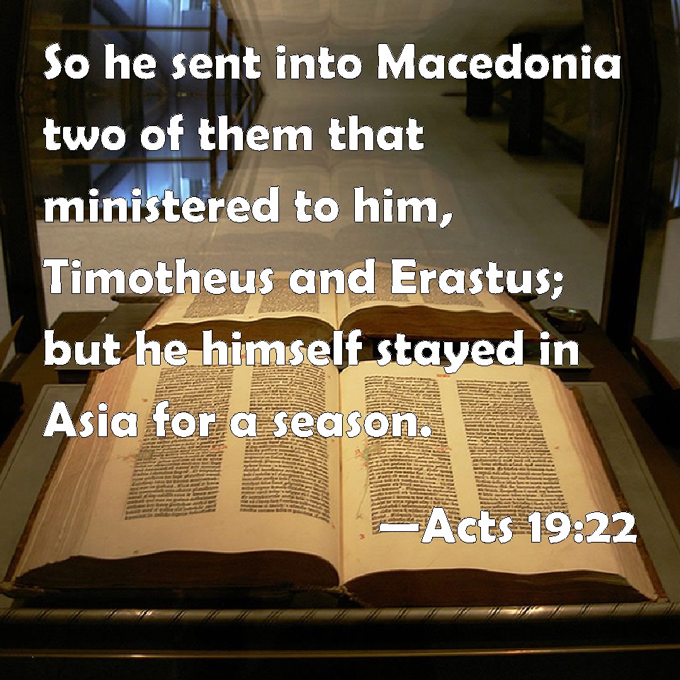Choose a Background Acts 19:22 So he sent into Macedonia two of them that ministered to him, Timotheus and Erastus; but he himself stayed in Asia for a season. KJV: So he sent into Macedonia two of them that ministered unto him, Timotheus and Erastus; but he himself stayed in Asia for a season. DRB: And sending into Macedonia two of them that ministered to him, Timothy and Erastus, he himself remained for a time in Asia. DBT: And having sent into Macedonia two of those ministering to him, Timotheus and Erastus, he remained himself awhile in Asia. ERV: And having sent into Macedonia two of them that ministered unto him, Timothy and Erastus, he himself stayed in Asia for a while. WBT: So he sent into Macedonia two of them that ministered to him, Timothy and Erastus; but he himself stayed in Asia for a season. WEB: Having sent into Macedonia two of those who served him, Timothy and Erastus, he himself stayed in Asia for a while. YLT: and having sent to Macedonia two of those ministering to him — Timotheus and Erastus — he himself stayed a time in Asia.Links Acts 19:22 NIV • Acts 19:22 NLT • Acts 19:22 ESV • Acts 19:22 NASB • Acts 19:22 KJV • Acts 19:22 Interlinear • Acts 19:22 Commentaries • Acts 19:22 Parallel Texts • Acts 19:22 Bible Apps • Acts 19:22 Parallel • Bible Hub |
