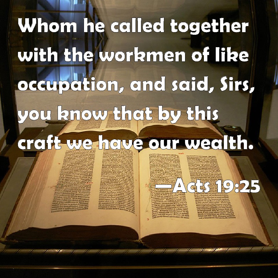 Choose a Background Acts 19:25 Whom he called together with the workmen of like occupation, and said, Sirs, you know that by this craft we have our wealth. KJV: Whom he called together with the workmen of like occupation, and said, Sirs, ye know that by this craft we have our wealth. DRB: Whom he calling together, with the workmen of like occupation, said: Sirs, you know that our gain is by this trade; DBT: whom having brought together, and those who wrought in such things, he said, Men, ye know that our well-living arises from this work, ERV: whom he gathered together, with the workmen of like occupation, and said, Sirs, ye know that by this business we have our wealth. WBT: Whom he called together with the workmen of like occupation, and said, Sirs, ye know that by this craft we have our wealth: WEB: whom he gathered together, with the workmen of like occupation, and said, "Sirs, you know that by this business we have our wealth. YLT: whom, having brought in a crowd together, and those who did work about such things, he said, 'Men, ye know that by this work we have our wealth;Links Acts 19:25 NIV • Acts 19:25 NLT • Acts 19:25 ESV • Acts 19:25 NASB • Acts 19:25 KJV • Acts 19:25 Interlinear • Acts 19:25 Commentaries • Acts 19:25 Parallel Texts • Acts 19:25 Bible Apps • Acts 19:25 Parallel • Bible Hub |