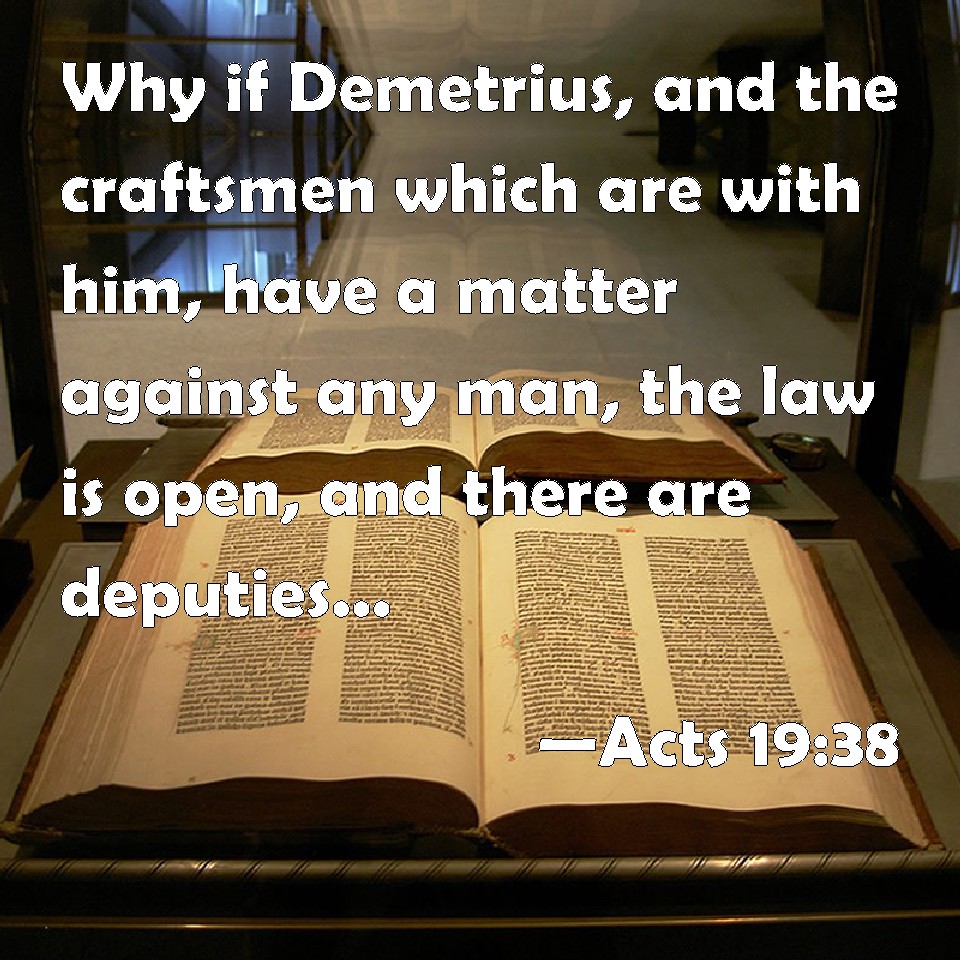 Choose a Background Acts 19:38 Why if Demetrius, and the craftsmen which are with him, have a matter against any man, the law is open, and there are deputies: let them accuse one another. KJV: Wherefore if Demetrius, and the craftsmen which are with him, have a matter against any man, the law is open, and there are deputies: let them implead one another. DRB: But if Demetrius and the craftsmen that are with him, have a matter against any man, the courts of justice are open, and there are proconsuls: let them accuse one another. DBT: If therefore Demetrius and the artisans who are with him have a matter against any one, the courts are being held, and there are proconsuls: let them accuse one another. ERV: If therefore Demetrius, and the craftsmen that are with him, have a matter against any man, the courts are open, and there are proconsuls: let them accuse one another. WBT: Wherefore, if Demetrius and the artificers who are with him, have a matter against any man, the law is open, and there are deputies: let them implead one another. WEB: If therefore Demetrius and the craftsmen who are with him have a matter against anyone, the courts are open, and there are proconsuls. Let them press charges against one another. YLT: if indeed, therefore, Demetrius and the artificers with him with any one have a matter, court days are held, and there are proconsuls; let them accuse one another.Links Acts 19:38 NIV • Acts 19:38 NLT • Acts 19:38 ESV • Acts 19:38 NASB • Acts 19:38 KJV • Acts 19:38 Interlinear • Acts 19:38 Commentaries • Acts 19:38 Parallel Texts • Acts 19:38 Bible Apps • Acts 19:38 Parallel • Bible Hub |