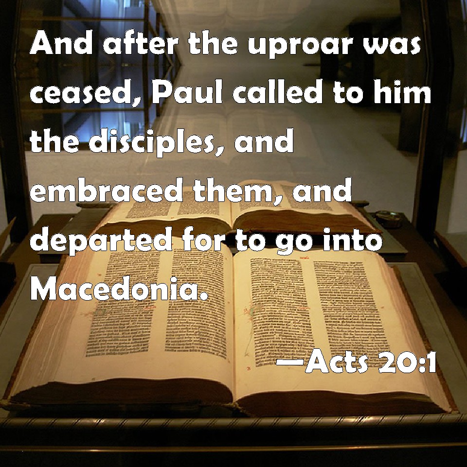 Choose a Background Acts 20:1 And after the uproar was ceased, Paul called to him the disciples, and embraced them, and departed for to go into Macedonia. KJV: And after the uproar was ceased, Paul called unto him the disciples, and embraced them, and departed for to go into Macedonia. DRB: AND after the tumult was ceased, Paul calling to him the disciples, and exhorting them, took his leave, and set forward to go into Macedonia. DBT: But after the tumult had ceased, Paul having called the disciples to him and embraced them, went away to go to Macedonia. ERV: And after the uproar was ceased, Paul having sent for the disciples and exhorted them, took leave of them, and departed for to go into Macedonia. WBT: And after the uproar had ceased, Paul called to him the disciples, and embraced them, and departed to go into Macedonia. WEB: After the uproar had ceased, Paul sent for the disciples, took leave of them, and departed to go into Macedonia. YLT: And after the ceasing of the tumult, Paul having called near the disciples, and having embraced them, went forth to go on to Macedonia;Links Acts 20:1 NIV • Acts 20:1 NLT • Acts 20:1 ESV • Acts 20:1 NASB • Acts 20:1 KJV • Acts 20:1 Interlinear • Acts 20:1 Commentaries • Acts 20:1 Parallel Texts • Acts 20:1 Bible Apps • Acts 20:1 Parallel • Bible Hub |