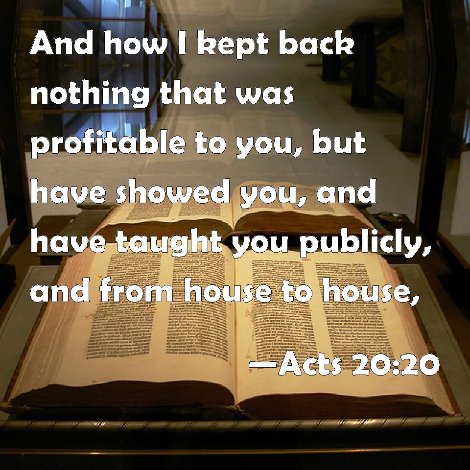 Choose a Background Acts 20:20 And how I kept back nothing that was profitable to you, but have showed you, and have taught you publicly, and from house to house, KJV: And how I kept back nothing that was profitable unto you, but have shewed you, and have taught you publickly, and from house to house, DRB: How I have kept back nothing that was profitable to you, but have preached it to you, and taught you publicly, and from house to house, DBT: how I held back nothing of what is profitable, so as not to announce it to you, and to teach you publicly and in every house, ERV: how that I shrank not from declaring unto you anything that was profitable, and teaching you publicly, and from house to house, WBT: And how I kept back nothing that was profitable to you, but have shown you, and have taught you publicly, and from house to house, WEB: how I didn't shrink from declaring to you anything that was profitable, teaching you publicly and from house to house, YLT: how nothing I did keep back of what things are profitable, not to declare to you, and to teach you publicly, and in every house,Links Acts 20:20 NIV • Acts 20:20 NLT • Acts 20:20 ESV • Acts 20:20 NASB • Acts 20:20 KJV • Acts 20:20 Interlinear • Acts 20:20 Commentaries • Acts 20:20 Parallel Texts • Acts 20:20 Bible Apps • Acts 20:20 Parallel • Bible Hub |