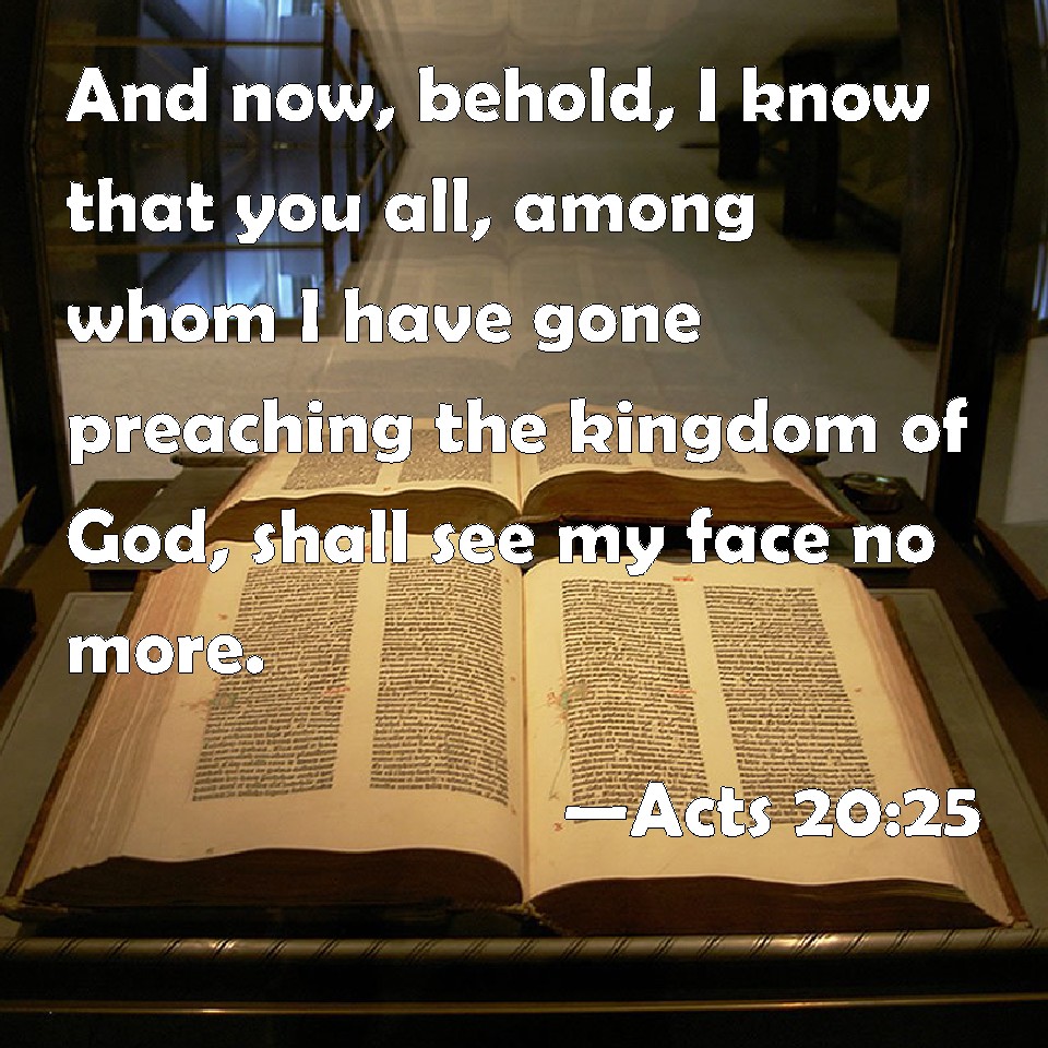 Choose a Background Acts 20:25 And now, behold, I know that you all, among whom I have gone preaching the kingdom of God, shall see my face no more. KJV: And now, behold, I know that ye all, among whom I have gone preaching the kingdom of God, shall see my face no more. DRB: And now behold, I know that all you, among whom I have gone preaching the kingdom of God, shall see my face no more. DBT: And now, behold, I know that ye all, among whom I have gone about preaching the kingdom of God, shall see my face no more. ERV: And now, behold, I know that ye all, among whom I went about preaching the kingdom, shall see my face no more. WBT: And now behold, I know that ye all, among whom I have gone preaching the kingdom of God, will see my face no more. WEB: "Now, behold, I know that you all, among whom I went about preaching the Kingdom of God, will see my face no more. YLT: And now, lo, I have known that no more shall ye see my face, — ye all among whom I did go preaching the reign of God;Links Acts 20:25 NIV • Acts 20:25 NLT • Acts 20:25 ESV • Acts 20:25 NASB • Acts 20:25 KJV • Acts 20:25 Interlinear • Acts 20:25 Commentaries • Acts 20:25 Parallel Texts • Acts 20:25 Bible Apps • Acts 20:25 Parallel • Bible Hub |