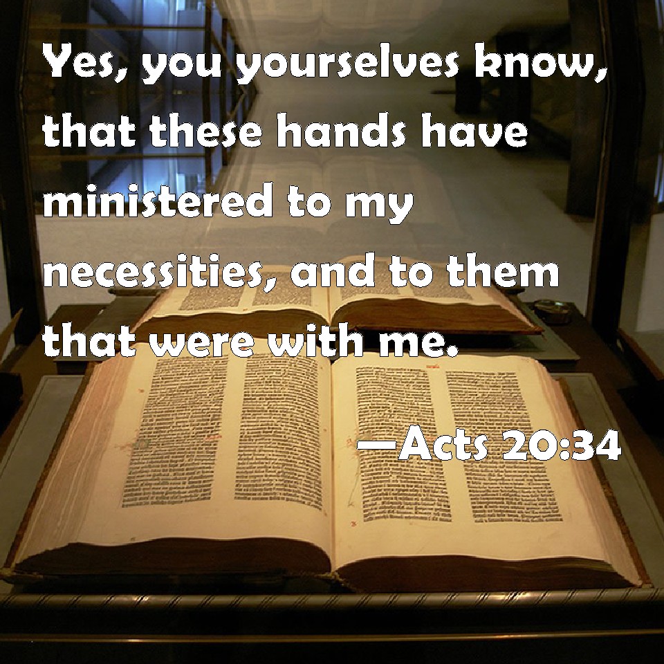 Choose a Background Acts 20:34 Yes, you yourselves know, that these hands have ministered to my necessities, and to them that were with me. KJV: Yea, ye yourselves know, that these hands have ministered unto my necessities, and to them that were with me. DRB: You yourselves know: for such things as were needful for me and them that are with me, these hands have furnished. DBT: Yourselves know that these hands have ministered to my wants, and to those who were with me. ERV: Ye yourselves know that these hands ministered unto my necessities, and to them that were with me. WBT: And ye yourselves know, that these hands have ministered to my necessities, and to them that were with me. WEB: You yourselves know that these hands served my necessities, and those who were with me. YLT: and ye yourselves know that to my necessities, and to those who were with me, minister did these hands;Links Acts 20:34 NIV • Acts 20:34 NLT • Acts 20:34 ESV • Acts 20:34 NASB • Acts 20:34 KJV • Acts 20:34 Interlinear • Acts 20:34 Commentaries • Acts 20:34 Parallel Texts • Acts 20:34 Bible Apps • Acts 20:34 Parallel • Bible Hub |