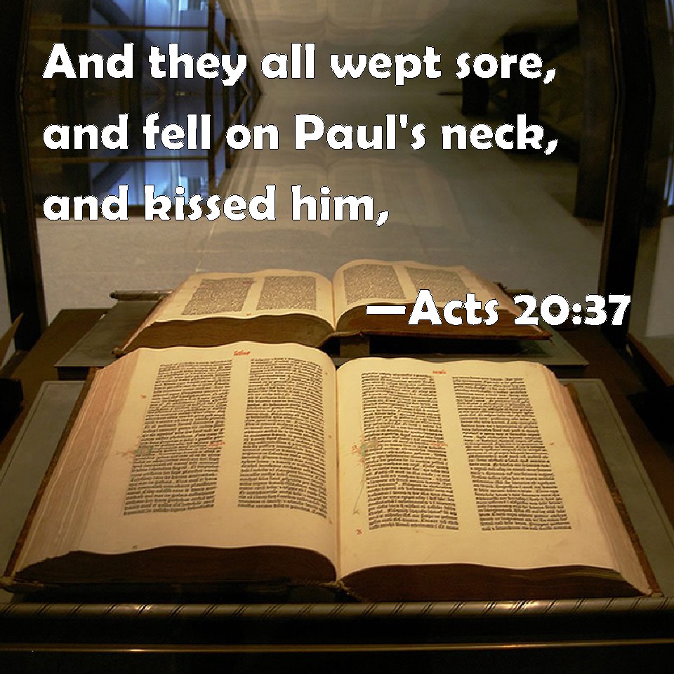 Choose a Background Acts 20:37 And they all wept sore, and fell on Paul's neck, and kissed him, KJV: And they all wept sore, and fell on Paul's neck, and kissed him, DRB: And there was much weeping among them all; and falling on the neck of Paul, they kissed him, DBT: And they all wept sore; and falling upon the neck of Paul they ardently kissed him, ERV: And they all wept sore, and fell on Paul's neck, and kissed him, WBT: And they all wept bitterly, and fell on Paul's neck, and kissed him, WEB: They all wept a lot, and fell on Paul's neck and kissed him, YLT: and there came a great weeping to all, and having fallen upon the neck of Paul, they were kissing him,Links Acts 20:37 NIV • Acts 20:37 NLT • Acts 20:37 ESV • Acts 20:37 NASB • Acts 20:37 KJV • Acts 20:37 Interlinear • Acts 20:37 Commentaries • Acts 20:37 Parallel Texts • Acts 20:37 Bible Apps • Acts 20:37 Parallel • Bible Hub |