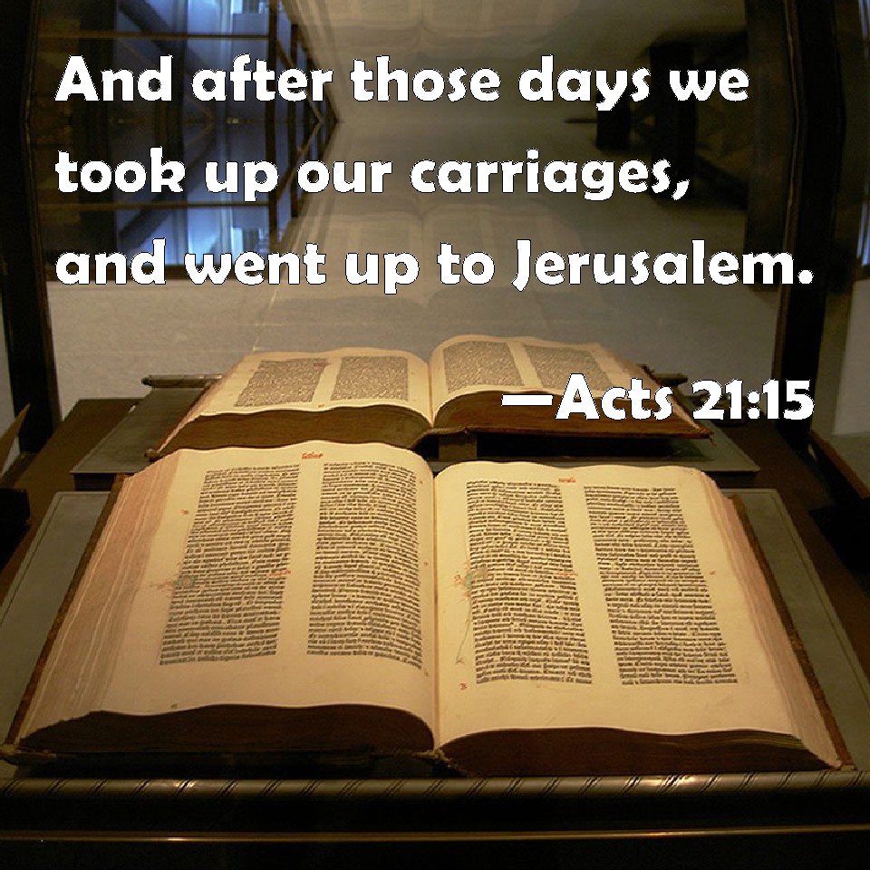 Choose a Background Acts 21:15 And after those days we took up our carriages, and went up to Jerusalem. KJV: And after those days we took up our carriages, and went up to Jerusalem. DRB: And after those days, being prepared, we went up to Jerusalem. DBT: And after these days, having got our effects ready, we went up to Jerusalem. ERV: And after these days we took up our baggage, and went up to Jerusalem. WBT: And after those days we took up our furniture, and went up to Jerusalem. WEB: After these days we took up our baggage and went up to Jerusalem. YLT: And after these days, having taken our vessels, we were going up to Jerusalem,Links Acts 21:15 NIV • Acts 21:15 NLT • Acts 21:15 ESV • Acts 21:15 NASB • Acts 21:15 KJV • Acts 21:15 Interlinear • Acts 21:15 Commentaries • Acts 21:15 Parallel Texts • Acts 21:15 Bible Apps • Acts 21:15 Parallel • Bible Hub |