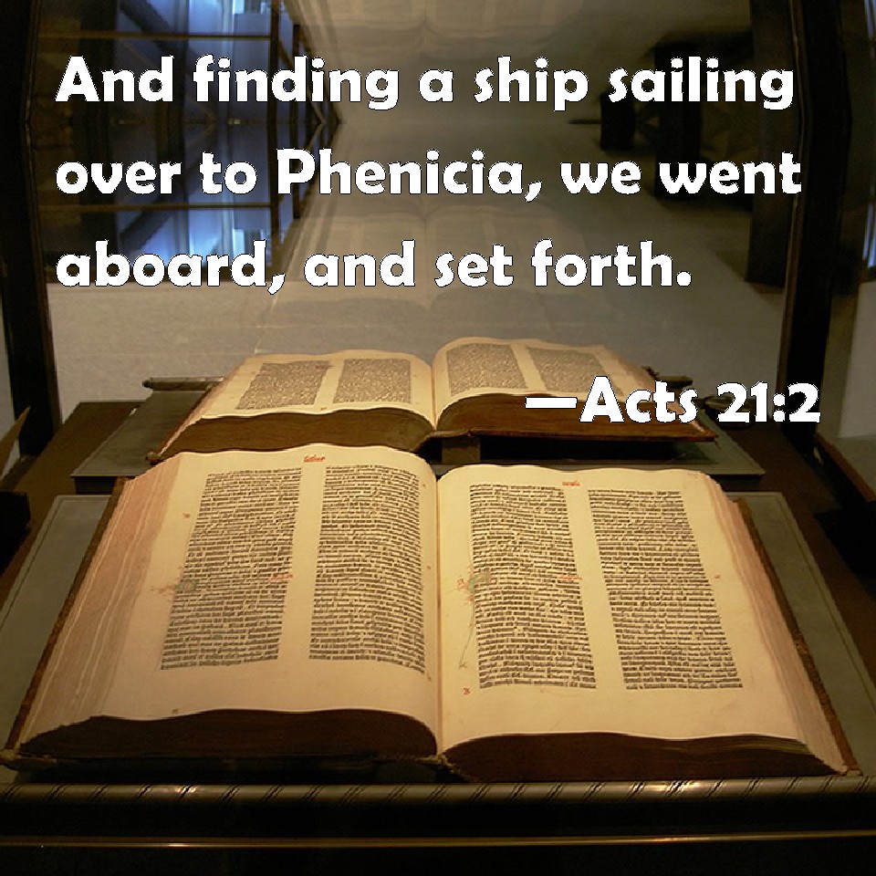 Choose a Background Acts 21:2 And finding a ship sailing over to Phenicia, we went aboard, and set forth. KJV: And finding a ship sailing over unto Phenicia, we went aboard, and set forth. DRB: And when we had found a ship sailing over to Phenice, we went aboard, and set forth. DBT: And having found a ship passing over into Phoenicia, we went on board and sailed; ERV: and having found a ship crossing over unto Phoenicia, we went aboard, and set sail. WBT: And finding a ship sailing over to Phenicia, we went aboard, and set forth. WEB: Having found a ship crossing over to Phoenicia, we went aboard, and set sail. YLT: and having found a ship passing over to Phenicia, having gone on board, we sailed,Links Acts 21:2 NIV • Acts 21:2 NLT • Acts 21:2 ESV • Acts 21:2 NASB • Acts 21:2 KJV • Acts 21:2 Interlinear • Acts 21:2 Commentaries • Acts 21:2 Parallel Texts • Acts 21:2 Bible Apps • Acts 21:2 Parallel • Bible Hub |
