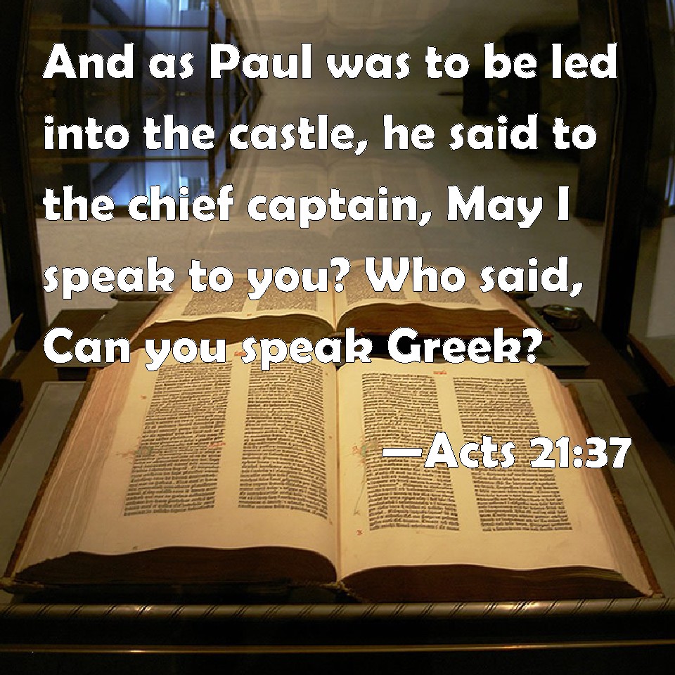Choose a Background Acts 21:37 And as Paul was to be led into the castle, he said to the chief captain, May I speak to you? Who said, Can you speak Greek? KJV: And as Paul was to be led into the castle, he said unto the chief captain, May I speak unto thee? Who said, Canst thou speak Greek? DRB: And as Paul was about to be brought into the castle, he saith to the tribune: May speak something to thee? Who said: Canst thou speak Greek? DBT: But as he was about to be led into the fortress, Paul says to the chiliarch, Is it allowed me to say something to thee? And he said, Dost thou know Greek? ERV: And as Paul was about to be brought into the castle, he saith unto the chief captain, May I say something unto thee? And he said, Dost thou know Greek? WBT: And as Paul was to be led into the castle, he said to the chief captain, May I speak to thee? Who said, Canst thou speak Greek? WEB: As Paul was about to be brought into the barracks, he asked the commanding officer, "May I speak to you?" He said, "Do you know Greek? YLT: And Paul being about to be led into the castle, saith to the chief captain, 'Is it permitted to me to say anything unto thee?' and he said, 'Greek dost thou know?Links Acts 21:37 NIV • Acts 21:37 NLT • Acts 21:37 ESV • Acts 21:37 NASB • Acts 21:37 KJV • Acts 21:37 Interlinear • Acts 21:37 Commentaries • Acts 21:37 Parallel Texts • Acts 21:37 Bible Apps • Acts 21:37 Parallel • Bible Hub |