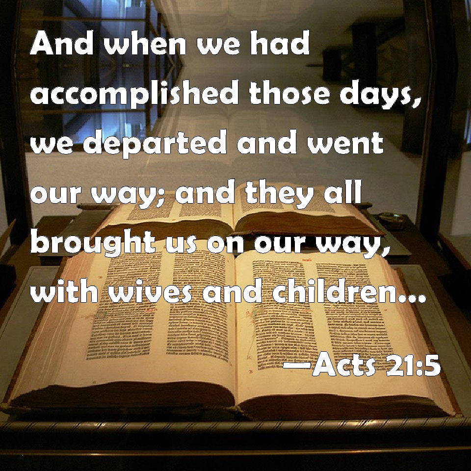 Choose a Background Acts 21:5 And when we had accomplished those days, we departed and went our way; and they all brought us on our way, with wives and children, till we were out of the city: and we kneeled down on the shore, and prayed. KJV: And when we had accomplished those days, we departed and went our way; and they all brought us on our way, with wives and children, till we were out of the city: and we kneeled down on the shore, and prayed. DRB: And the days being expired, departing we went forward, they all bringing us on our way, with their wives and children, till we were out of the city: and we kneeled down on the shore, and we prayed. DBT: But when we had completed the days, we set out and took our journey, all of them accompanying us, with wives and children, till we were out of the city. And kneeling down upon the shore we prayed. ERV: And when it came to pass that we had accomplished the days, we departed and went on our journey; and they all, with wives and children, brought us on our way, till we were out of the city: and kneeling down on the beach, we prayed, WBT: And when we had accomplished those days, we departed, and proceeded on our way; and they all conducted us with wives and children, till we were out of the city; and we kneeled down on the shore, and prayed. WEB: When it happened that we had accomplished the days, we departed and went on our journey. They all, with wives and children, brought us on our way until we were out of the city. Kneeling down on the beach, we prayed. YLT: but when it came that we completed the days, having gone forth, we went on, all bringing us on the way, with women and children, unto the outside of the city, and having bowed the knees upon the shore, we prayed,Links Acts 21:5 NIV • Acts 21:5 NLT • Acts 21:5 ESV • Acts 21:5 NASB • Acts 21:5 KJV • Acts 21:5 Interlinear • Acts 21:5 Commentaries • Acts 21:5 Parallel Texts • Acts 21:5 Bible Apps • Acts 21:5 Parallel • Bible Hub |