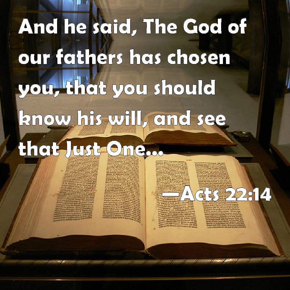 Choose a Background Acts 22:14 And he said, The God of our fathers has chosen you, that you should know his will, and see that Just One, and should hear the voice of his mouth. KJV: And he said, The God of our fathers hath chosen thee, that thou shouldest know his will, and see that Just One, and shouldest hear the voice of his mouth. DRB: But he said: The God of our fathers hath preordained thee that thou shouldst know his will, and see the Just One, and shouldst hear the voice from his mouth. DBT: And he said, The God of our fathers has chosen thee beforehand to know his will, and to see the just one, and to hear a voice out of his mouth; ERV: And he said, The God of our fathers hath appointed thee to know his will, and to see the Righteous One, and to hear a voice from his mouth. WBT: And he said, The God of our fathers hath chosen thee, that thou shouldst know his will, and see that Just One, and shouldst hear the voice of his mouth. WEB: He said, 'The God of our fathers has appointed you to know his will, and to see the Righteous One, and to hear a voice from his mouth. YLT: and he said, The God of our fathers did choose thee beforehand to know His will, and to see the Righteous One, and to hear a voice out of his mouth,Links Acts 22:14 NIV • Acts 22:14 NLT • Acts 22:14 ESV • Acts 22:14 NASB • Acts 22:14 KJV • Acts 22:14 Interlinear • Acts 22:14 Commentaries • Acts 22:14 Parallel Texts • Acts 22:14 Bible Apps • Acts 22:14 Parallel • Bible Hub |