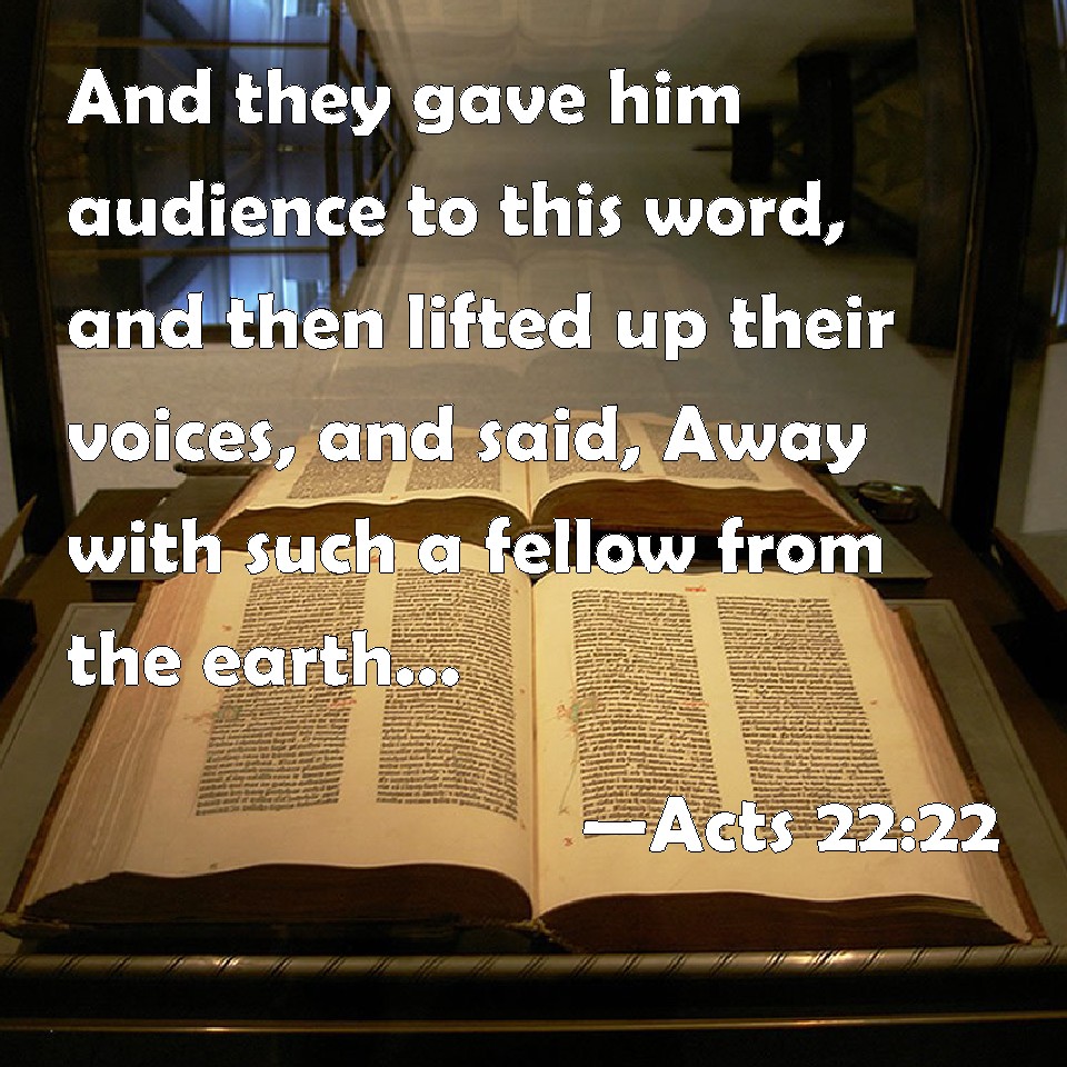 Choose a Background Acts 22:22 And they gave him audience to this word, and then lifted up their voices, and said, Away with such a fellow from the earth: for it is not fit that he should live. KJV: And they gave him audience unto this word, and then lifted up their voices, and said, Away with such a fellow from the earth: for it is not fit that he should live. DRB: And they heard him until this word, and then lifted up their voice, saying: Away with such an one from the earth; for it is not fit that he should live. DBT: And they heard him until this word, and lifted up their voice, saying, Away with such a one as that from the earth, for it was not fit he should live. ERV: And they gave him audience unto this word; and they lifted up their voice, and said, Away with such a fellow from the earth: for it is not fit that he should live. WBT: And they gave him audience to this word, and then lifted up their voices, and said, Away with such a man from the earth: for it is not fit that he should live. WEB: They listened to him until he said that; then they lifted up their voice, and said, "Rid the earth of this fellow, for he isn't fit to live!" YLT: And they were hearing him unto this word, and they lifted up their voice, saying, 'Away from the earth with such an one; for it is not fit for him to live.'Links Acts 22:22 NIV • Acts 22:22 NLT • Acts 22:22 ESV • Acts 22:22 NASB • Acts 22:22 KJV • Acts 22:22 Interlinear • Acts 22:22 Commentaries • Acts 22:22 Parallel Texts • Acts 22:22 Bible Apps • Acts 22:22 Parallel • Bible Hub |