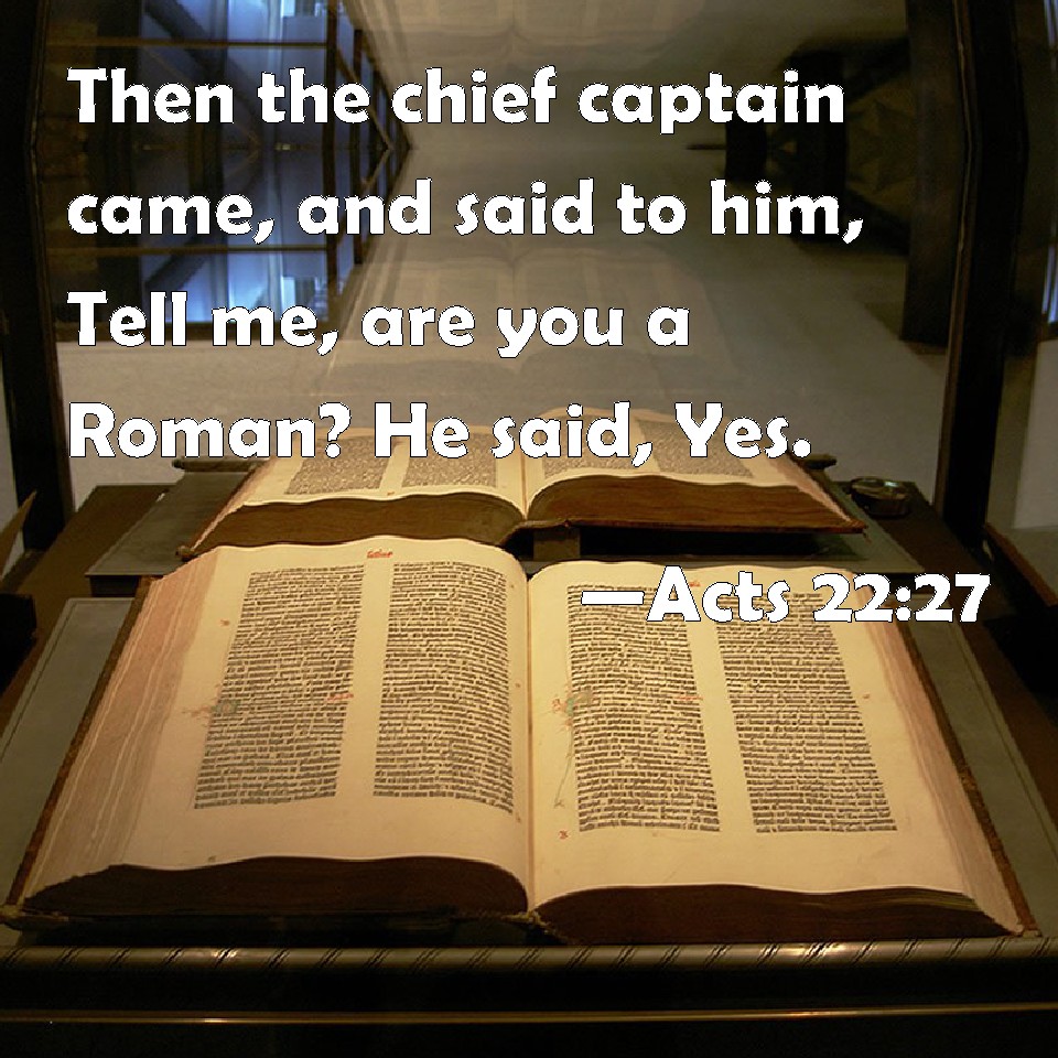 Choose a Background Acts 22:27 Then the chief captain came, and said to him, Tell me, are you a Roman? He said, Yes. KJV: Then the chief captain came, and said unto him, Tell me, art thou a Roman? He said, Yea. DRB: And the tribune coming, said to him: Tell me, art thou a Roman? But he said: Yea. DBT: And the chiliarch coming up said to him, Tell me, Art thou a Roman? And he said, Yes. ERV: And the chief captain came, and said unto him, Tell me, art thou a Roman? And he said, Yea. WBT: Then the chief captain came, and said to him, Tell me, art thou a Roman? He said, Yes. WEB: The commanding officer came and asked him, "Tell me, are you a Roman?" He said, "Yes." YLT: and the chief captain having come near, said to him, 'Tell me, art thou a Roman?' and he said, 'Yes;'Links Acts 22:27 NIV • Acts 22:27 NLT • Acts 22:27 ESV • Acts 22:27 NASB • Acts 22:27 KJV • Acts 22:27 Interlinear • Acts 22:27 Commentaries • Acts 22:27 Parallel Texts • Acts 22:27 Bible Apps • Acts 22:27 Parallel • Bible Hub |