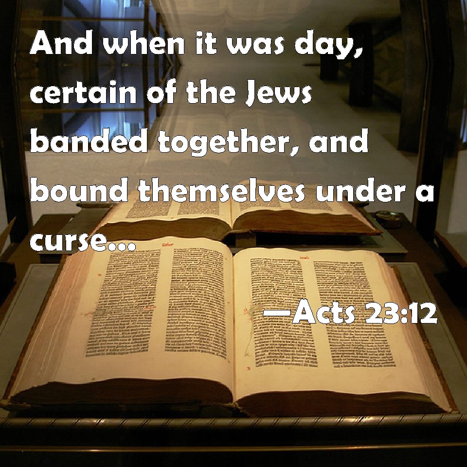 Choose a Background Acts 23:12 And when it was day, certain of the Jews banded together, and bound themselves under a curse, saying that they would neither eat nor drink till they had killed Paul. KJV: And when it was day, certain of the Jews banded together, and bound themselves under a curse, saying that they would neither eat nor drink till they had killed Paul. DRB: And when day was come, some of the Jews gathered together, and bound themselves under a curse, saying, that they would neither eat, nor drink, till they killed Paul. DBT: And when it was day, the Jews, having banded together, put themselves under a curse, saying that they would neither eat nor drink till they should kill Paul. ERV: And when it was day, the Jews banded together, and bound themselves under a curse, saying that they would neither eat nor drink till they had killed Paul. WBT: And when it was day, certain of the Jews banded together, and bound themselves under a curse, saying, that they would neither eat nor drink till they had killed Paul. WEB: When it was day, some of the Jews banded together, and bound themselves under a curse, saying that they would neither eat nor drink until they had killed Paul. YLT: And day having come, certain of the Jews having made a concourse, did anathematize themselves, saying neither to eat nor to drink till they may kill Paul;Links Acts 23:12 NIV • Acts 23:12 NLT • Acts 23:12 ESV • Acts 23:12 NASB • Acts 23:12 KJV • Acts 23:12 Interlinear • Acts 23:12 Commentaries • Acts 23:12 Parallel Texts • Acts 23:12 Bible Apps • Acts 23:12 Parallel • Bible Hub |