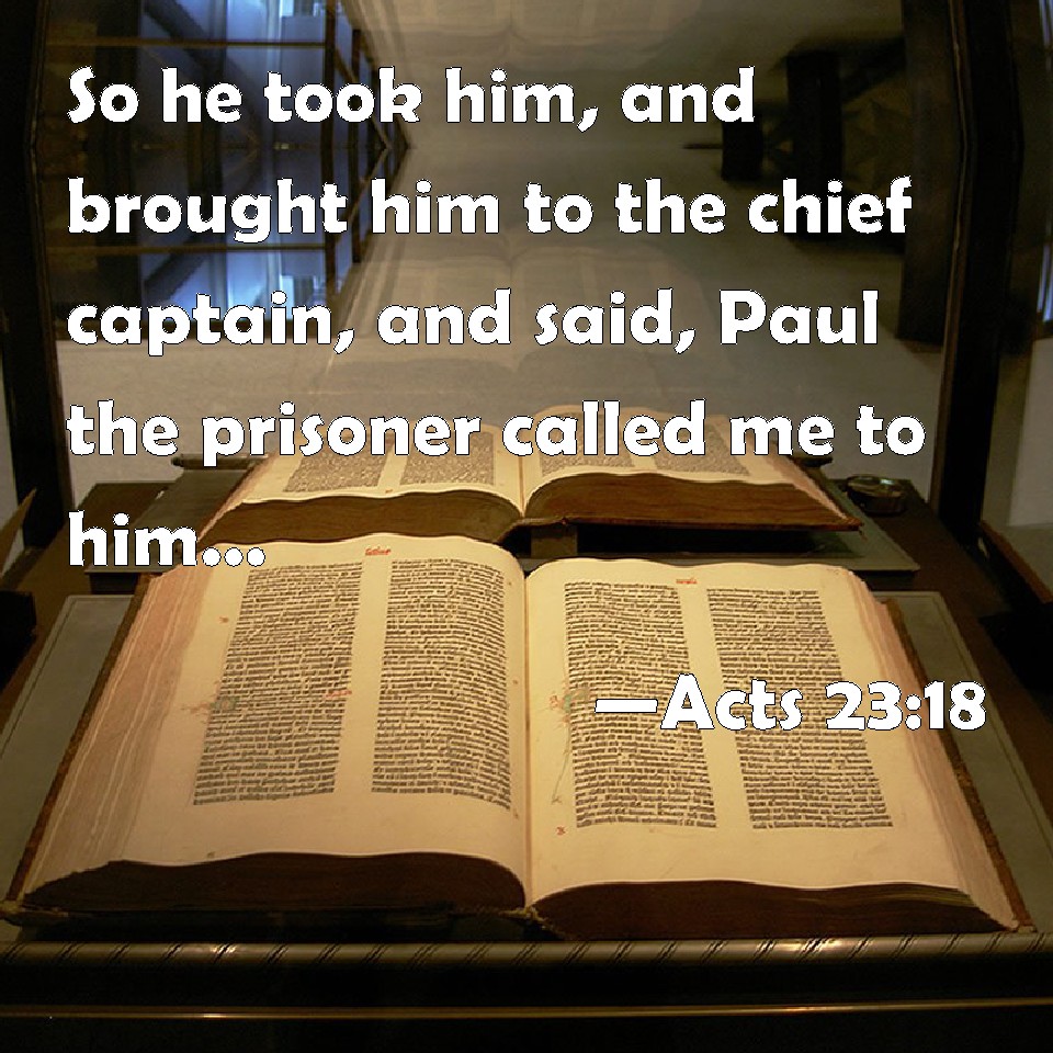 Choose a Background Acts 23:18 So he took him, and brought him to the chief captain, and said, Paul the prisoner called me to him, and prayed me to bring this young man to you, who has something to say to you. KJV: So he took him, and brought him to the chief captain, and said, Paul the prisoner called me unto him, and prayed me to bring this young man unto thee, who hath something to say unto thee. DRB: And he taking him, brought him to the tribune, and said: Paul, the prisoner, desired me to bring this young man unto thee, who hath some thing to say to thee. DBT: He therefore, having taken him with him, led him to the chiliarch, and says, The prisoner Paul called me to him and asked me to lead this youth to thee, who has something to say to thee. ERV: So he took him, and brought him to the chief captain, and saith, Paul the prisoner called me unto him, and asked me to bring this young man unto thee, who hath something to say to thee. WBT: So he took him, and brought him to the chief captain, and said, Paul the prisoner called me to him, and prayed me to bring this young man to thee, who hath something to say to thee. WEB: So he took him, and brought him to the commanding officer, and said, "Paul, the prisoner, summoned me and asked me to bring this young man to you, who has something to tell you." YLT: He indeed, then, having taken him, brought him unto the chief captain, and saith, 'The prisoner Paul, having called me near, asked me this young man to bring unto thee, having something to say to thee.'Links Acts 23:18 NIV • Acts 23:18 NLT • Acts 23:18 ESV • Acts 23:18 NASB • Acts 23:18 KJV • Acts 23:18 Interlinear • Acts 23:18 Commentaries • Acts 23:18 Parallel Texts • Acts 23:18 Bible Apps • Acts 23:18 Parallel • Bible Hub |