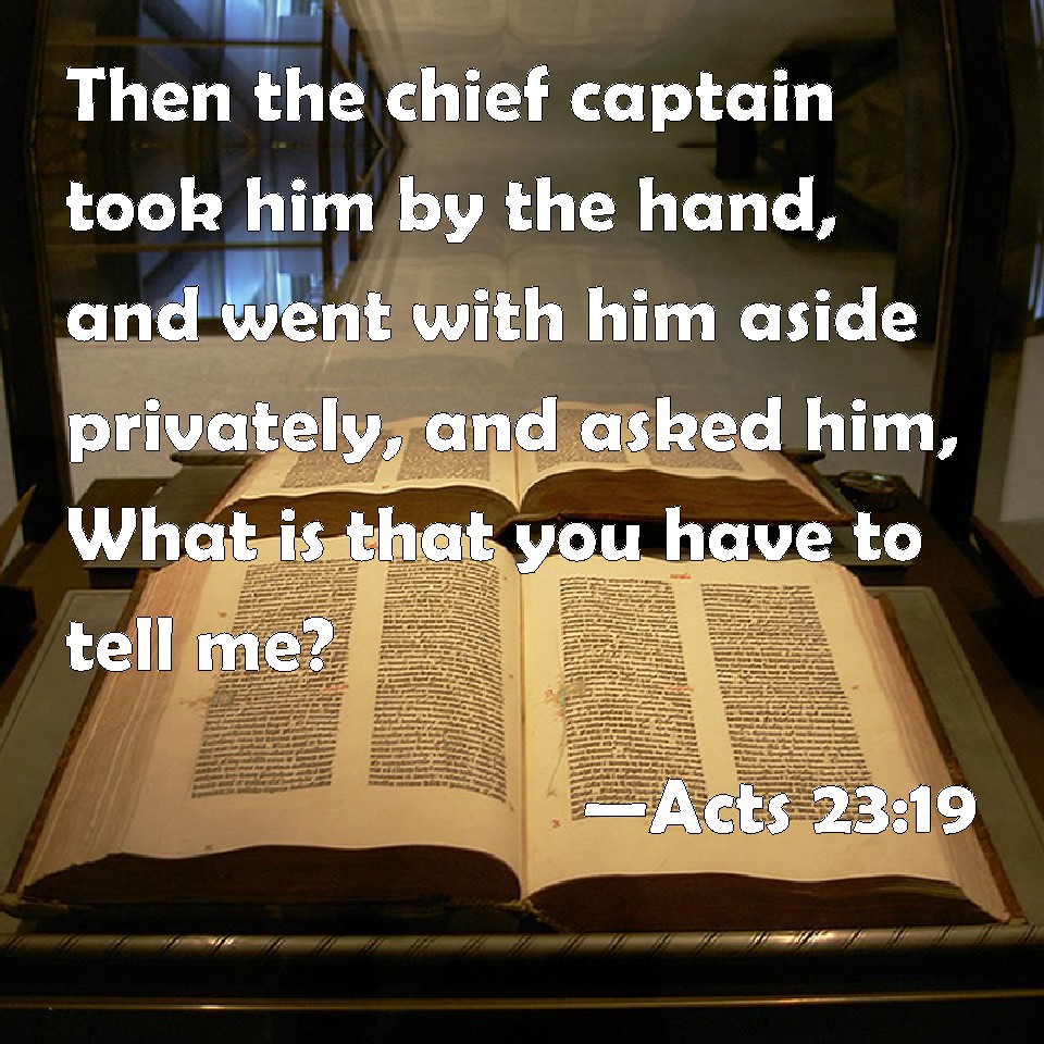 Choose a Background Acts 23:19 Then the chief captain took him by the hand, and went with him aside privately, and asked him, What is that you have to tell me? KJV: Then the chief captain took him by the hand, and went with him aside privately, and asked him, What is that thou hast to tell me? DRB: And the tribune taking him by the hand, went aside with him privately, and asked him: What is it that thou hast to tell me? DBT: And the chiliarch having taken him by the hand, and having gone apart in private, inquired, What is it that thou hast to report to me? ERV: And the chief captain took him by the hand, and going aside asked him privately, What is that thou hast to tell me? WBT: Then the chief captain took him by the hand, and went with him aside privately, and asked him, What is that thou hast to tell me? WEB: The commanding officer took him by the hand, and going aside, asked him privately, "What is it that you have to tell me?" YLT: And the chief captain having taken him by the hand, and having withdrawn by themselves, inquired, 'What is that which thou hast to tell me?'Links Acts 23:19 NIV • Acts 23:19 NLT • Acts 23:19 ESV • Acts 23:19 NASB • Acts 23:19 KJV • Acts 23:19 Interlinear • Acts 23:19 Commentaries • Acts 23:19 Parallel Texts • Acts 23:19 Bible Apps • Acts 23:19 Parallel • Bible Hub |
