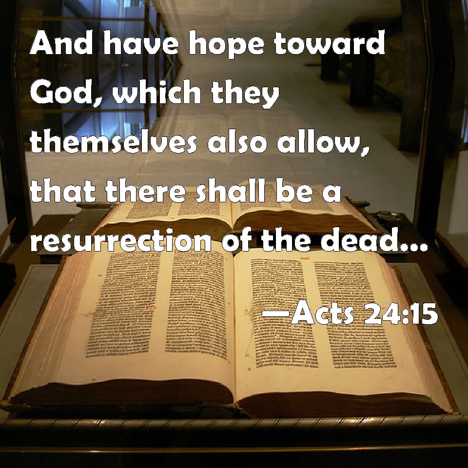 Choose a Background Acts 24:15 And have hope toward God, which they themselves also allow, that there shall be a resurrection of the dead, both of the just and unjust. KJV: And have hope toward God, which they themselves also allow, that there shall be a resurrection of the dead, both of the just and unjust. DRB: Having hope in God, which these also themselves look for, that there shall be a resurrection of the just and unjust. DBT: having hope towards God, which they themselves also receive, that there is to be a resurrection both of just and unjust. ERV: having hope toward God, which these also themselves look for, that there shall be a resurrection both of the just and unjust. WBT: And have hope towards God, which they themselves also allow, that there will be a resurrection of the dead, both of the just and unjust. WEB: having hope toward God, which these also themselves look for, that there will be a resurrection of the dead, both of the just and unjust. YLT: having hope toward God, which they themselves also wait for, that there is about to be a rising again of the dead, both of righteous and unrighteous;Links Acts 24:15 NIV • Acts 24:15 NLT • Acts 24:15 ESV • Acts 24:15 NASB • Acts 24:15 KJV • Acts 24:15 Interlinear • Acts 24:15 Commentaries • Acts 24:15 Parallel Texts • Acts 24:15 Bible Apps • Acts 24:15 Parallel • Bible Hub |