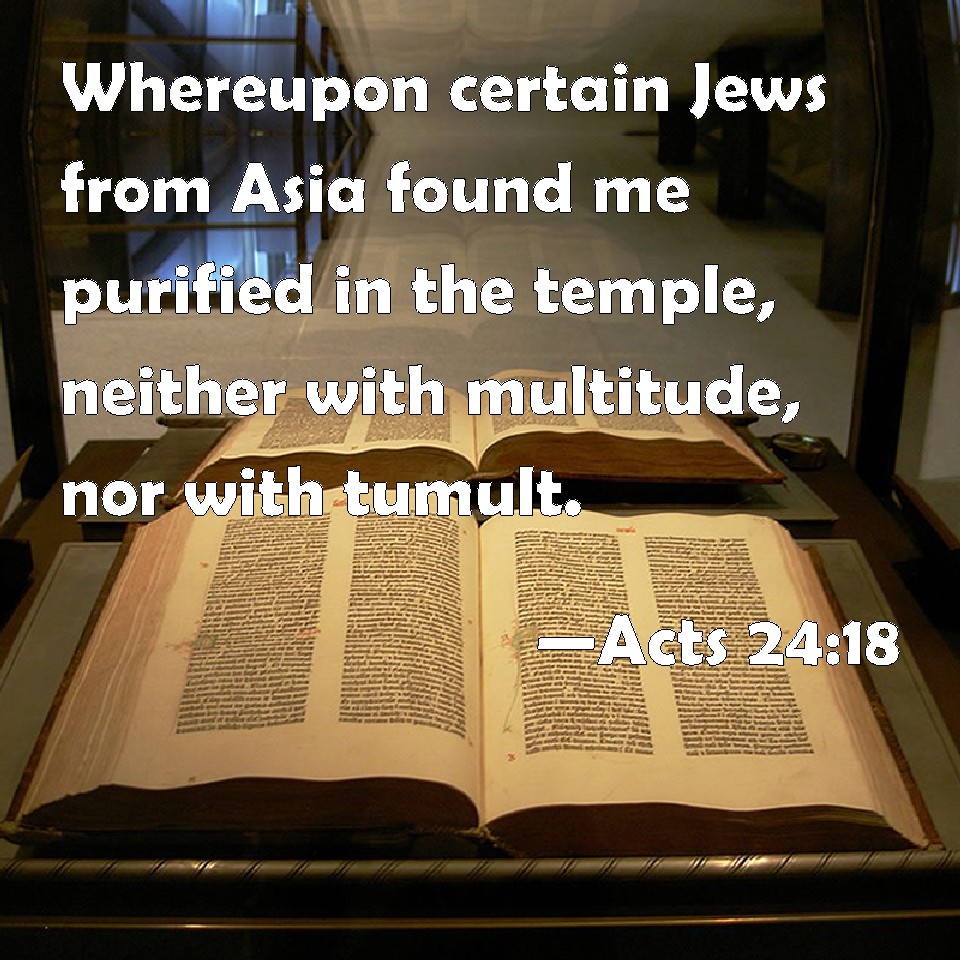 Choose a Background Acts 24:18 Whereupon certain Jews from Asia found me purified in the temple, neither with multitude, nor with tumult. KJV: Whereupon certain Jews from Asia found me purified in the temple, neither with multitude, nor with tumult. DRB: In which I was found purified in the temple: neither with multitude, nor with tumult. DBT: Whereupon they found me purified in the temple, with neither crowd nor tumult. But it was certain Jews from Asia, ERV: amidst which they found me purified in the temple, with no crowd, nor yet with tumult: but there were certain Jews from Asia— WBT: Upon which certain Jews from Asia found me purified in the temple, neither with multitude, nor with tumult. WEB: amid which certain Jews from Asia found me purified in the temple, not with a mob, nor with turmoil. YLT: in which certain Jews from Asia did find me purified in the temple, not with multitude, nor with tumult,Links Acts 24:18 NIV • Acts 24:18 NLT • Acts 24:18 ESV • Acts 24:18 NASB • Acts 24:18 KJV • Acts 24:18 Interlinear • Acts 24:18 Commentaries • Acts 24:18 Parallel Texts • Acts 24:18 Bible Apps • Acts 24:18 Parallel • Bible Hub |