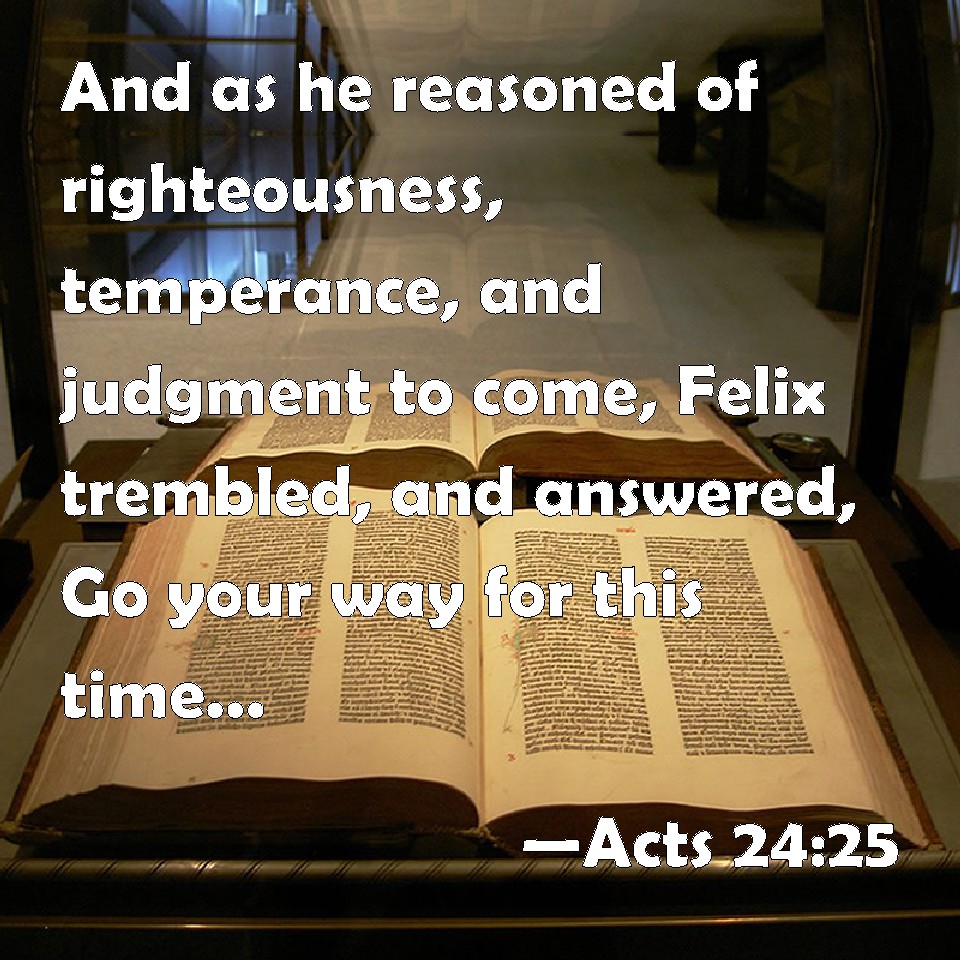 Choose a Background Acts 24:25 And as he reasoned of righteousness, temperance, and judgment to come, Felix trembled, and answered, Go your way for this time; when I have a convenient season, I will call for you. KJV: And as he reasoned of righteousness, temperance, and judgment to come, Felix trembled, and answered, Go thy way for this time; when I have a convenient season, I will call for thee. DRB: And as he treated of justice, and chastity, and of the judgment to come, Felix being terrified, answered: For this time, go thy way: but when I have a convenient time, I will send for thee. DBT: And as he reasoned concerning righteousness, and temperance, and the judgment about to come, Felix, being filled with fear, answered, Go for the present, and when I get an opportunity I will send for thee; ERV: And as he reasoned of righteousness, and temperance, and the judgment to come, Felix was terrified, and answered, Go thy way for this time; and when I have a convenient season, I will call thee unto me. WBT: And as he reasoned of righteousness, temperance, and judgment to come, Felix trembled, and answered, depart for this time; when I have a convenient season, I will call for thee. WEB: As he reasoned about righteousness, self-control, and the judgment to come, Felix was terrified, and answered, "Go your way for this time, and when it is convenient for me, I will summon you." YLT: and he reasoning concerning righteousness, and temperance, and the judgment that is about to be, Felix, having become afraid, answered, 'For the present be going, and having got time, I will call for thee;'Links Acts 24:25 NIV • Acts 24:25 NLT • Acts 24:25 ESV • Acts 24:25 NASB • Acts 24:25 KJV • Acts 24:25 Interlinear • Acts 24:25 Commentaries • Acts 24:25 Parallel Texts • Acts 24:25 Bible Apps • Acts 24:25 Parallel • Bible Hub |
