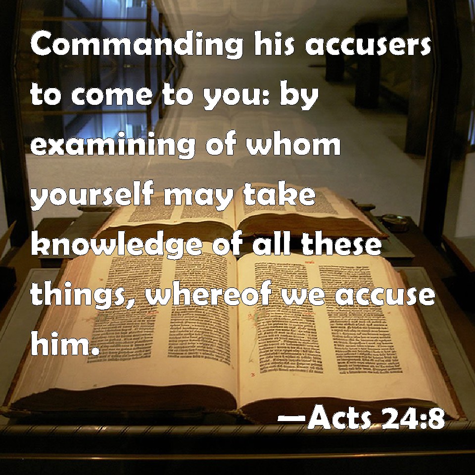 Choose a Background Acts 24:8 Commanding his accusers to come to you: by examining of whom yourself may take knowledge of all these things, whereof we accuse him. KJV: Commanding his accusers to come unto thee: by examining of whom thyself mayest take knowledge of all these things, whereof we accuse him. DRB: Commanding his accusers to come to thee: of whom thou mayest thyself, by examination, have knowledge of all these things, whereof we accuse him. DBT: having commanded his accusers to come to thee; of whom thou canst thyself, in examining him, know the certainty of all these things of which we accuse him. ERV: from whom thou wilt be able, by examining him thyself, to take knowledge of all these things, whereof we accuse him. WBT: Commanding his accusers to come to thee: by examining whom, thou thyself mayest take knowledge of all these things of which we accuse him. WEB: By examining him yourself you may ascertain all these things of which we accuse him." YLT: having commanded his accusers to come to thee, from whom thou mayest be able, thyself having examined, to know concerning all these things of which we accuse him;'Links Acts 24:8 NIV • Acts 24:8 NLT • Acts 24:8 ESV • Acts 24:8 NASB • Acts 24:8 KJV • Acts 24:8 Interlinear • Acts 24:8 Commentaries • Acts 24:8 Parallel Texts • Acts 24:8 Bible Apps • Acts 24:8 Parallel • Bible Hub |