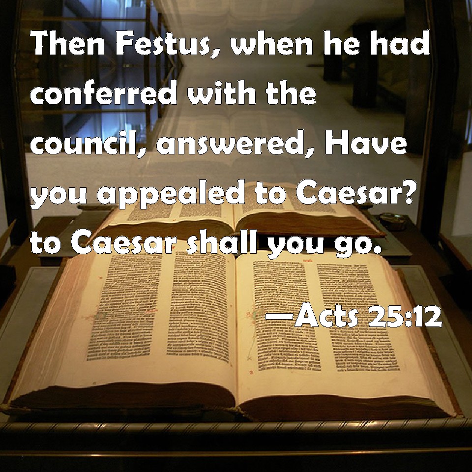 Choose a Background Acts 25:12 Then Festus, when he had conferred with the council, answered, Have you appealed to Caesar? to Caesar shall you go. KJV: Then Festus, when he had conferred with the council, answered, Hast thou appealed unto Caesar? unto Caesar shalt thou go. DRB: Then Festus having conferred with the council, answered: Hast thou appealed to Caesar? To Caesar shalt thou go. DBT: Then Festus, having conferred with the council, answered, Thou hast appealed to Caesar. To Caesar shalt thou go. ERV: Then Festus, when he had conferred with the council, answered, Thou hast appealed unto Caesar: unto Caesar shalt thou go. WBT: Then Festus, when he had conferred with the council, answered, Hast thou appealed to Cesar? to Cesar thou shalt go. WEB: Then Festus, when he had conferred with the council, answered, "You have appealed to Caesar. To Caesar you shall go." YLT: then Festus, having communed with the council, answered, 'To Caesar thou hast appealed; to Caesar thou shalt go.'Links Acts 25:12 NIV • Acts 25:12 NLT • Acts 25:12 ESV • Acts 25:12 NASB • Acts 25:12 KJV • Acts 25:12 Interlinear • Acts 25:12 Commentaries • Acts 25:12 Parallel Texts • Acts 25:12 Bible Apps • Acts 25:12 Parallel • Bible Hub |
