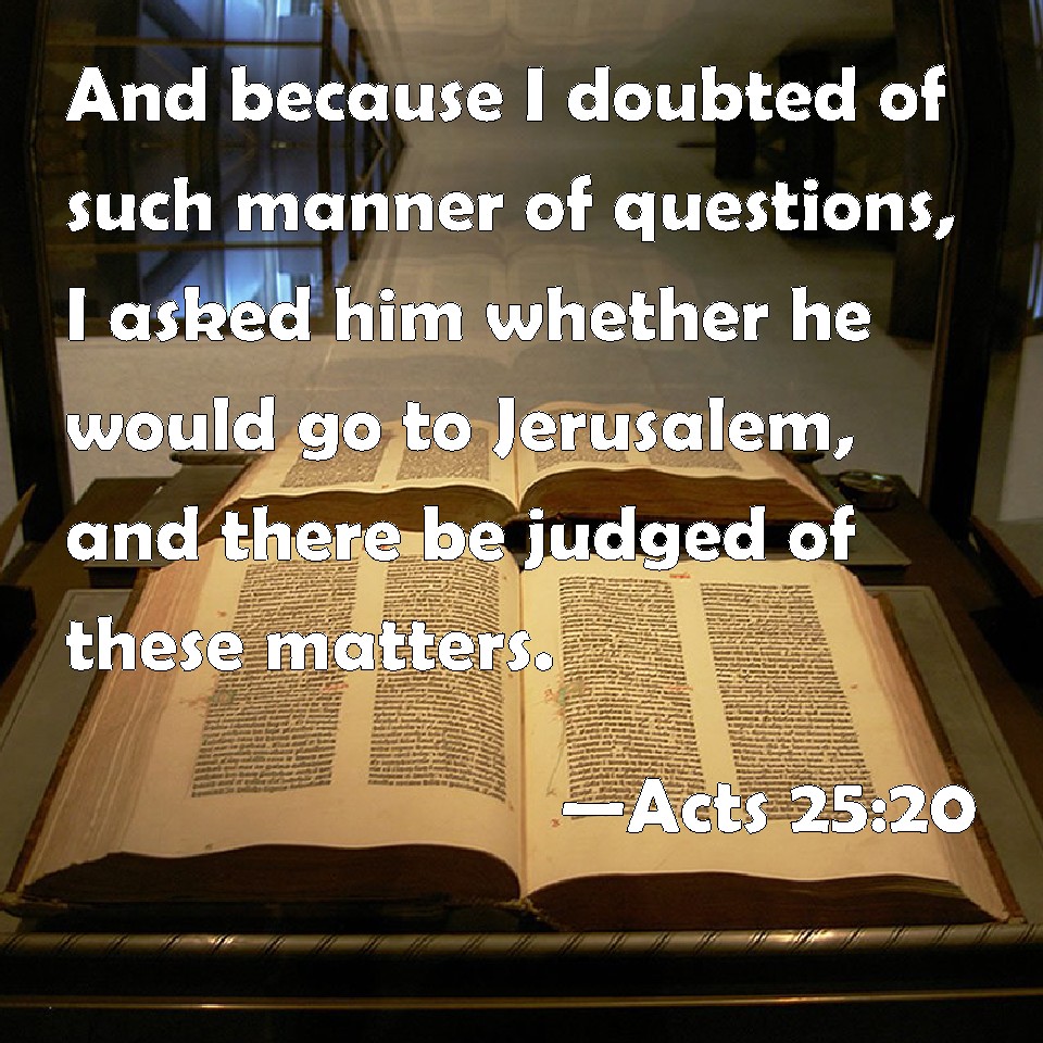 Choose a Background Acts 25:20 And because I doubted of such manner of questions, I asked him whether he would go to Jerusalem, and there be judged of these matters. KJV: And because I doubted of such manner of questions, I asked him whether he would go to Jerusalem, and there be judged of these matters. DRB: I therefore being in a doubt of this manner of question, asked him whether he would go to Jerusalem, and there be judged of these things. DBT: And as I myself was at a loss as to an inquiry into these things, I said, Was he willing to go to Jerusalem and there to be judged concerning these things? ERV: And I, being perplexed how to inquire concerning these things, asked whether he would go to Jerusalem, and there be judged of these matters. WBT: And because I doubted of such manner of questions, I asked him whether he would go to Jerusalem, and there be judged concerning these matters. WEB: Being perplexed how to inquire concerning these things, I asked whether he was willing to go to Jerusalem and there be judged concerning these matters. YLT: and I, doubting in regard to the question concerning this, said, If he would wish to go on to Jerusalem, and there to be judged concerning these things — Links Acts 25:20 NIV • Acts 25:20 NLT • Acts 25:20 ESV • Acts 25:20 NASB • Acts 25:20 KJV • Acts 25:20 Interlinear • Acts 25:20 Commentaries • Acts 25:20 Parallel Texts • Acts 25:20 Bible Apps • Acts 25:20 Parallel • Bible Hub |