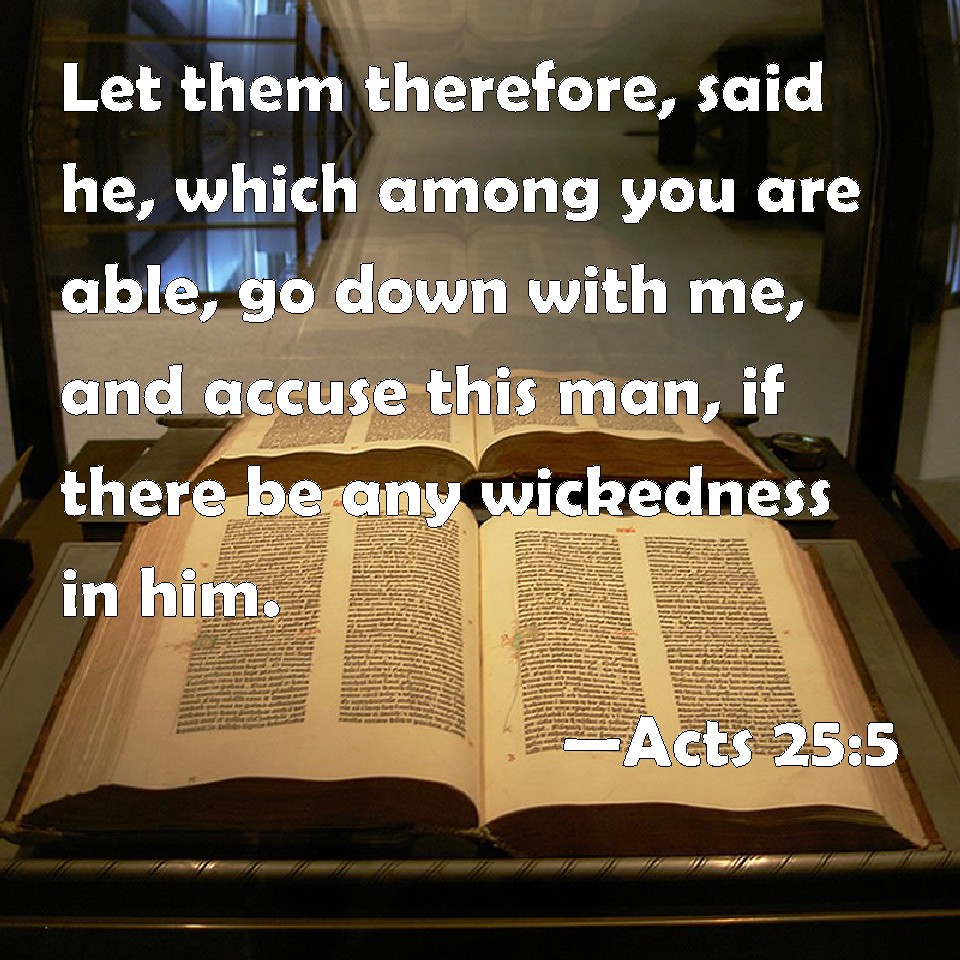 Choose a Background Acts 25:5 Let them therefore, said he, which among you are able, go down with me, and accuse this man, if there be any wickedness in him. KJV: Let them therefore, said he, which among you are able, go down with me, and accuse this man, if there be any wickedness in him. DRB: Let them, therefore, saith he, among you that are able, go down with me, and accuse him, if there be any crime in the man. DBT: Let therefore the persons of authority among you, says he, going down too, if there be anything in this man, accuse him. ERV: Let them therefore, saith he, which are of power among you, go down with me, and if there is anything amiss in the man, let them accuse him. WBT: Let them therefore, said he, who among you are able, go down with me, and accuse this man, if there is any wickedness in him. WEB: "Let them therefore," said he, "that are in power among you go down with me, and if there is anything wrong in the man, let them accuse him." YLT: Therefore those able among you — saith he — having come down together, if there be anything in this man — let them accuse him;'Links Acts 25:5 NIV • Acts 25:5 NLT • Acts 25:5 ESV • Acts 25:5 NASB • Acts 25:5 KJV • Acts 25:5 Interlinear • Acts 25:5 Commentaries • Acts 25:5 Parallel Texts • Acts 25:5 Bible Apps • Acts 25:5 Parallel • Bible Hub |
